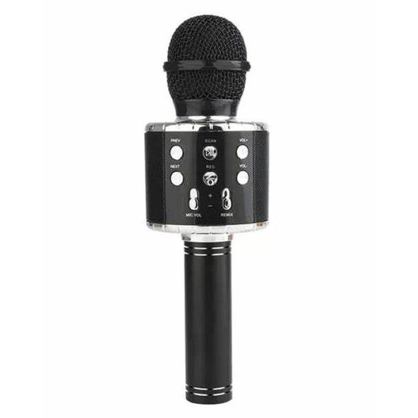 Black WSโ858 Bluetooth Karaoke Microphone -The WSโ858 is a wireless karaoke mic with built-in Bluetooth speaker, echo effects, and voice control. Perfect for singing, recording, or party fun, it features easy connectivity, clear sound, and up to 8 hours of playtime.