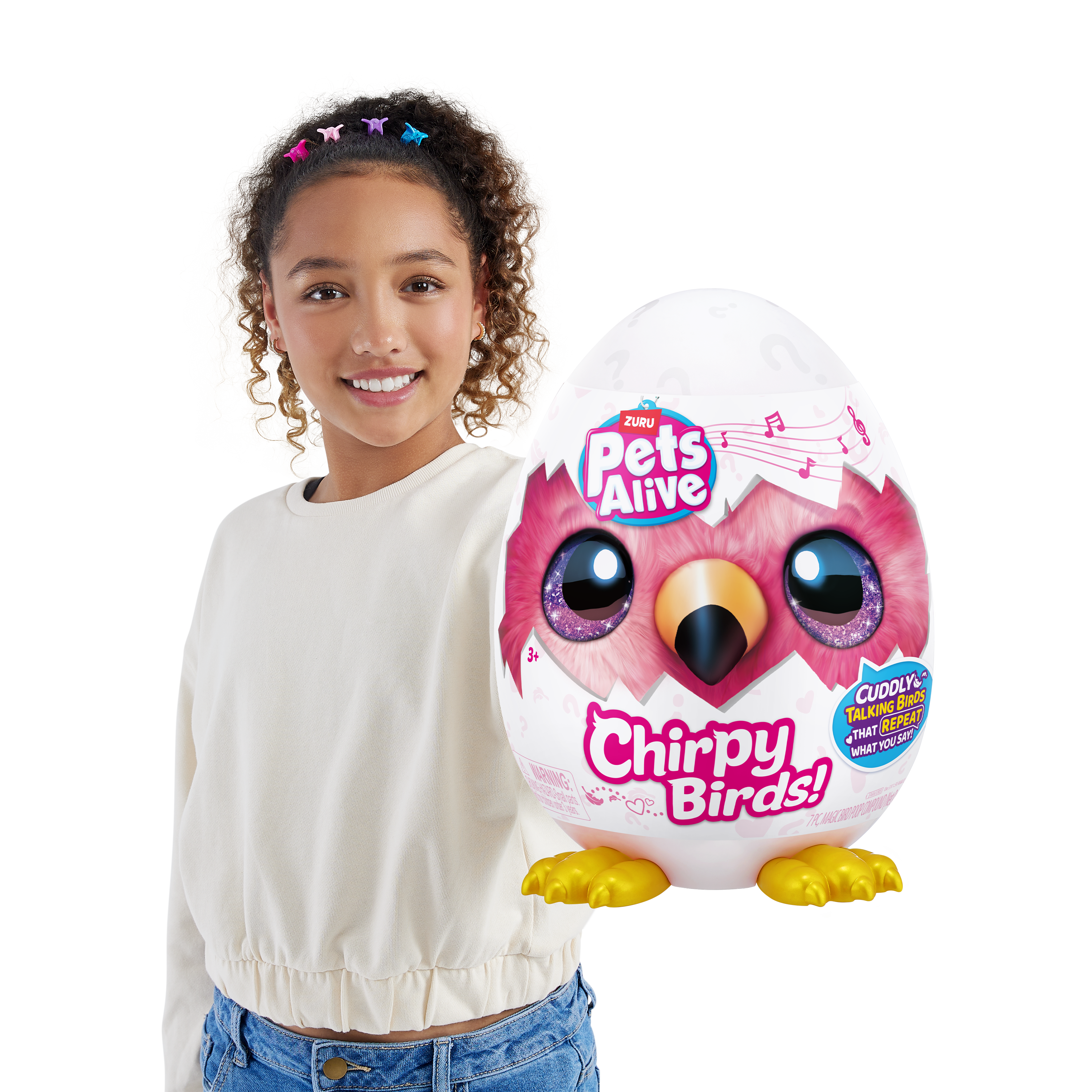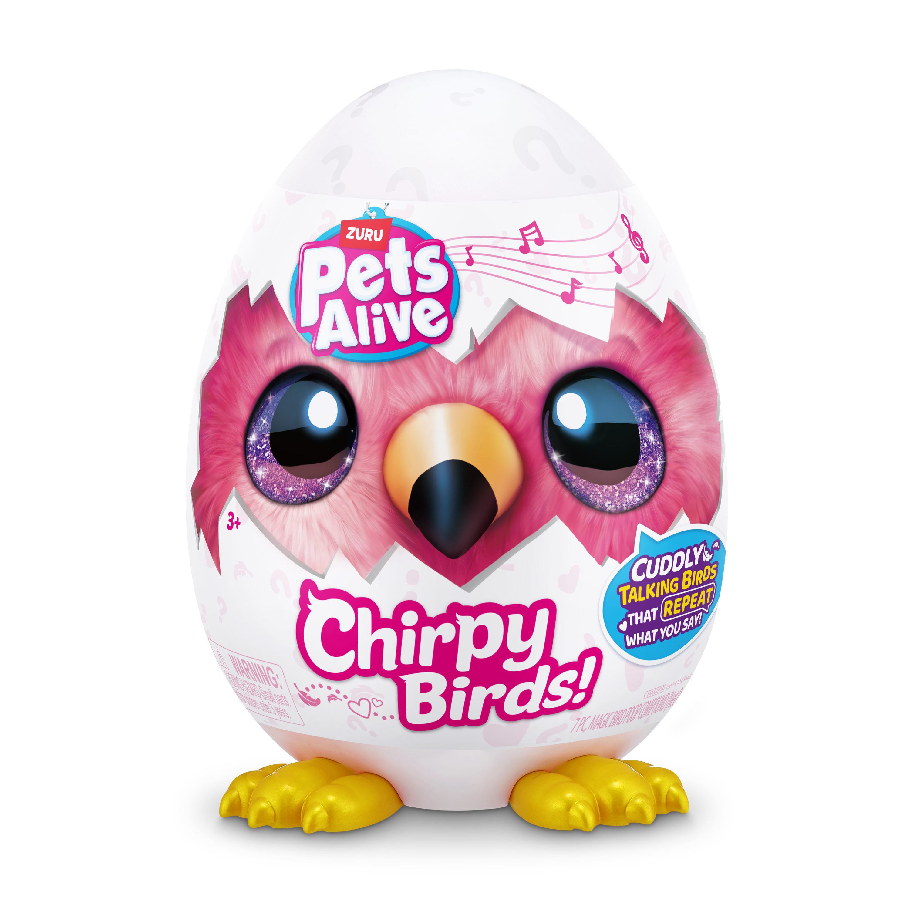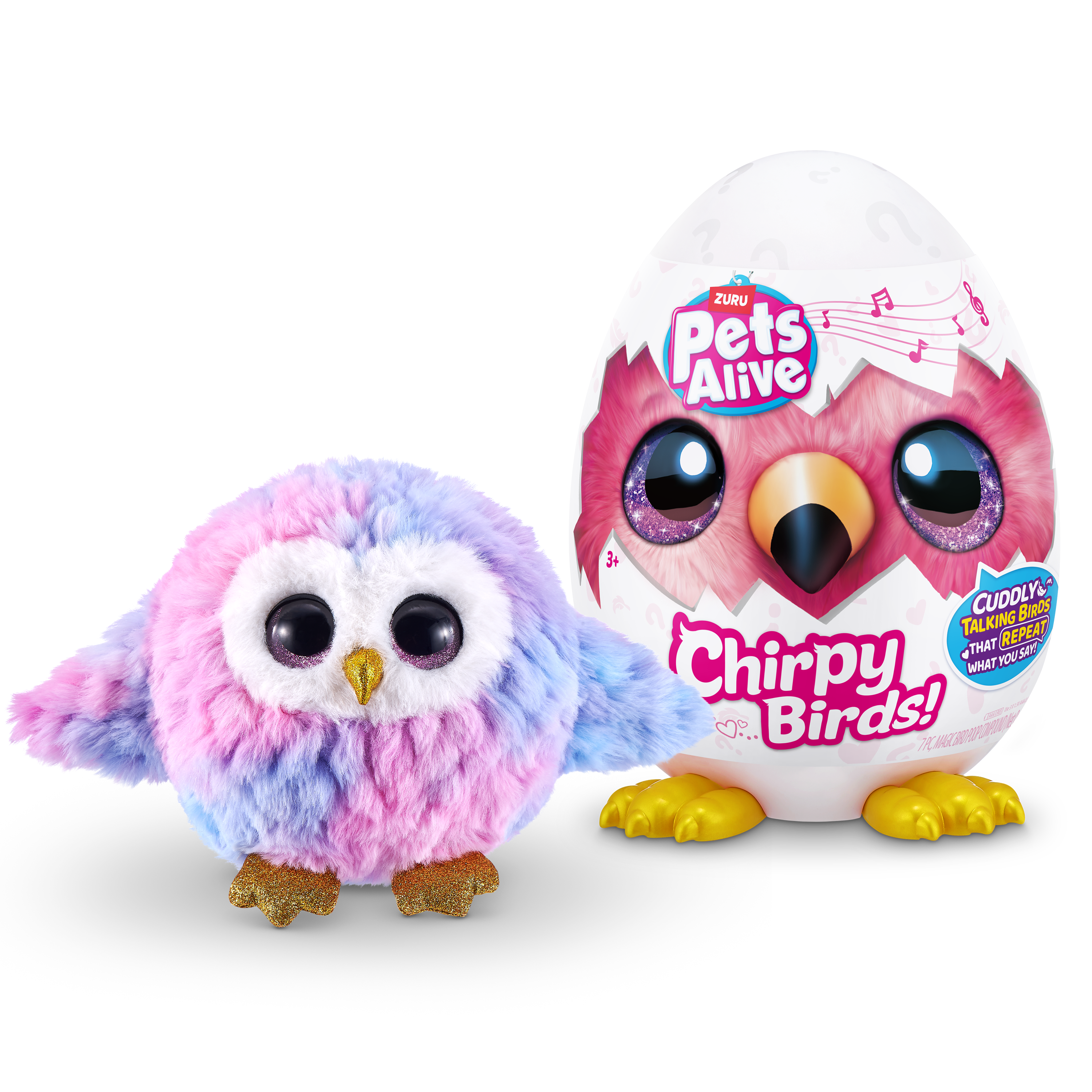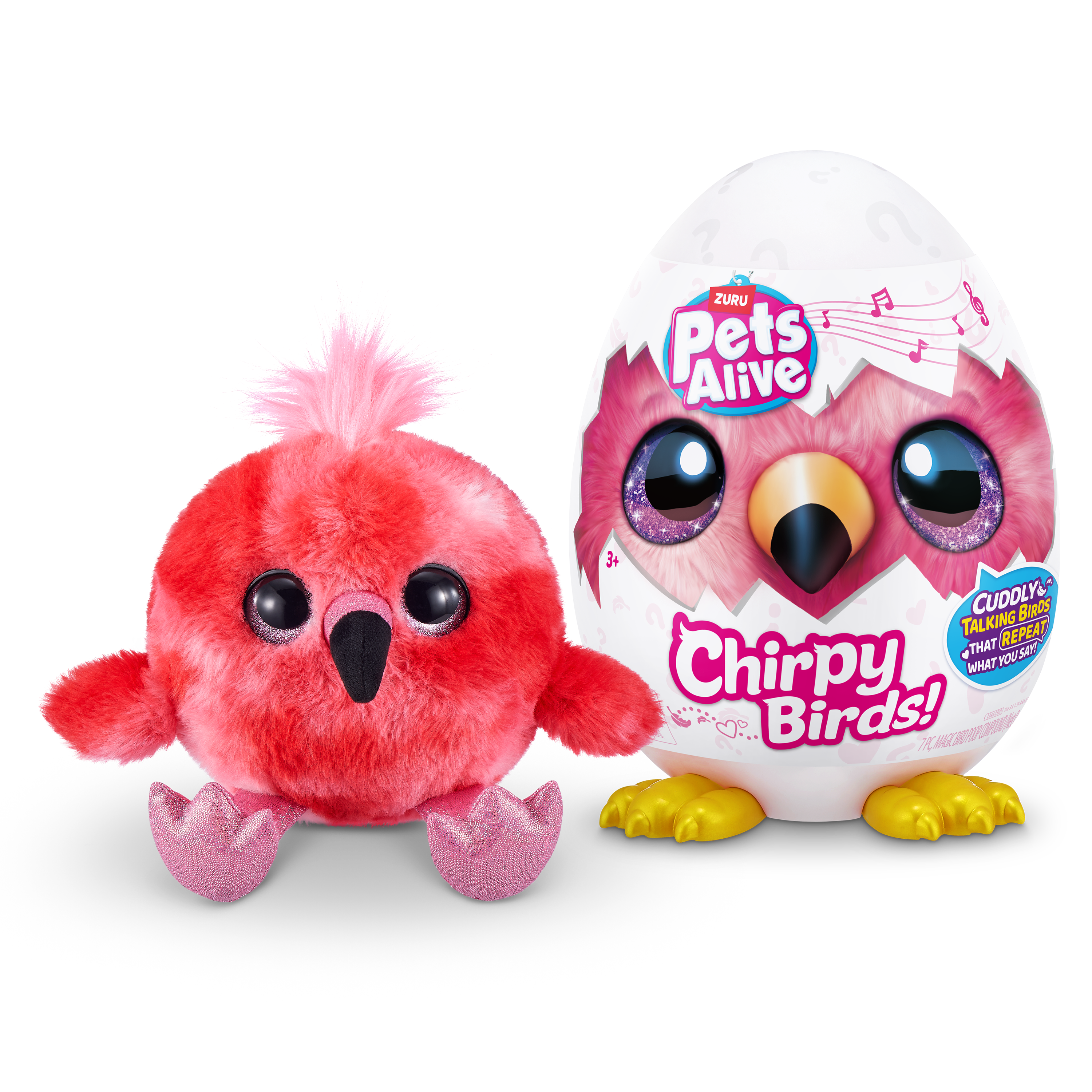 Meet the chirpiest birds around! These super soft and cuddly Chirpy Birds always have something to chat about! Chat to your new chirpy friend and whatever you say, they'll copy you! They'll also sing you their favorite chirpy tunes! With 5 surprises inside this egg, get cracking to meet your new chirpy pal!