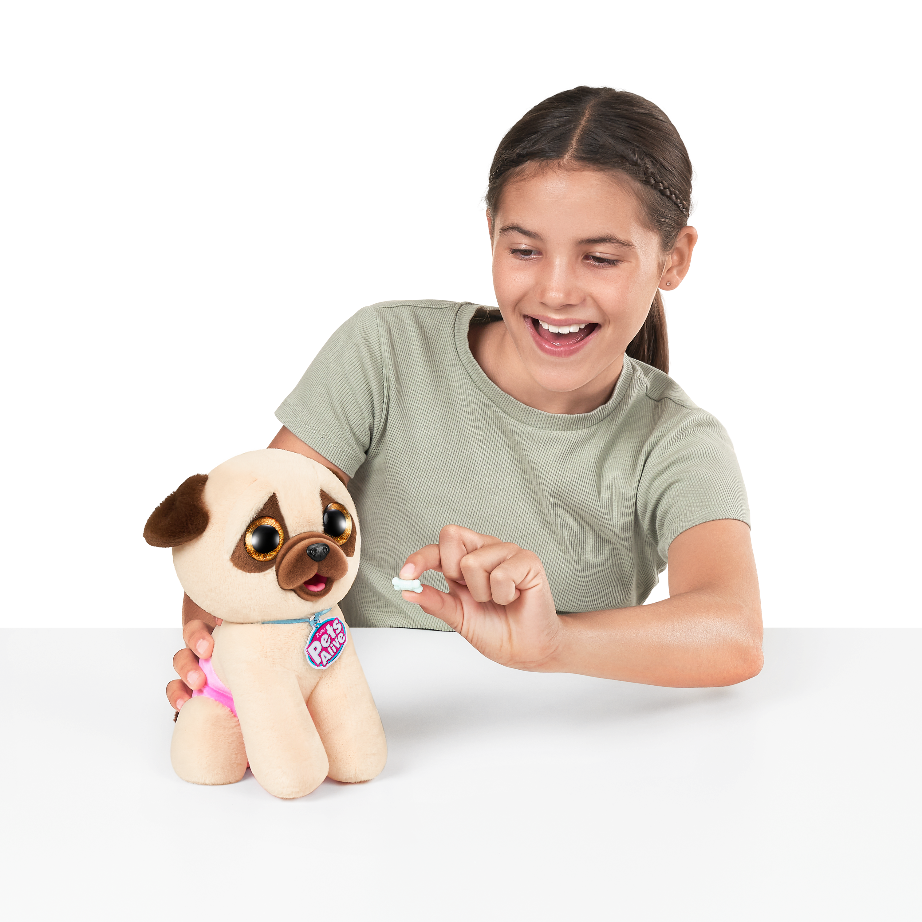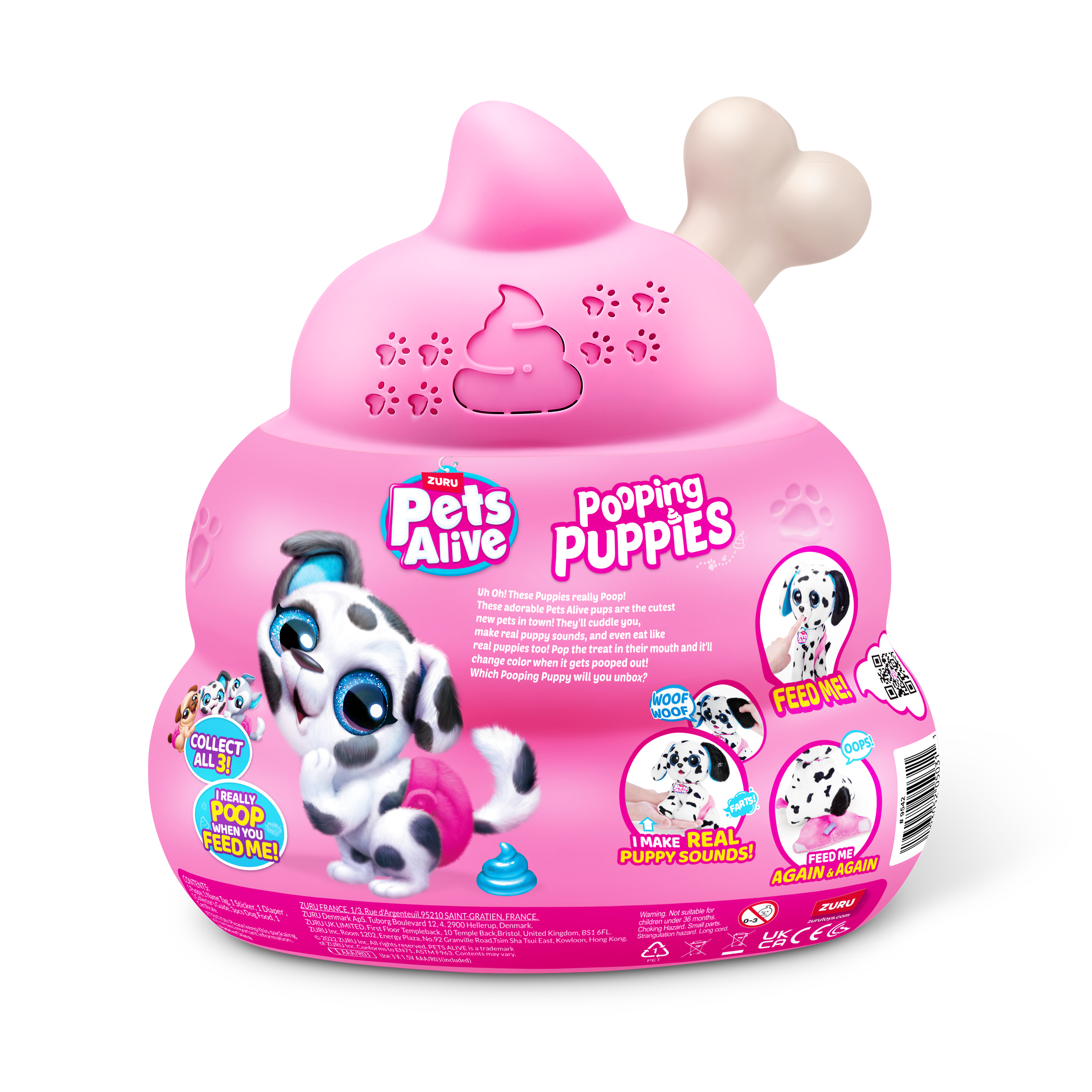 Uh oh! These Puppies have got to go! These adorable puppies are as real as it gets. They will cuddle you, bark for you and even eat like real puppies too. Once their tummies are full, they'll need to go! Watch them poop with color changing magic! Your new Pets Alive Pooping Puppy can't wait to become your new furry friend! There are 3 puppies to collect, will you adopt the pug, dalmation or husky?