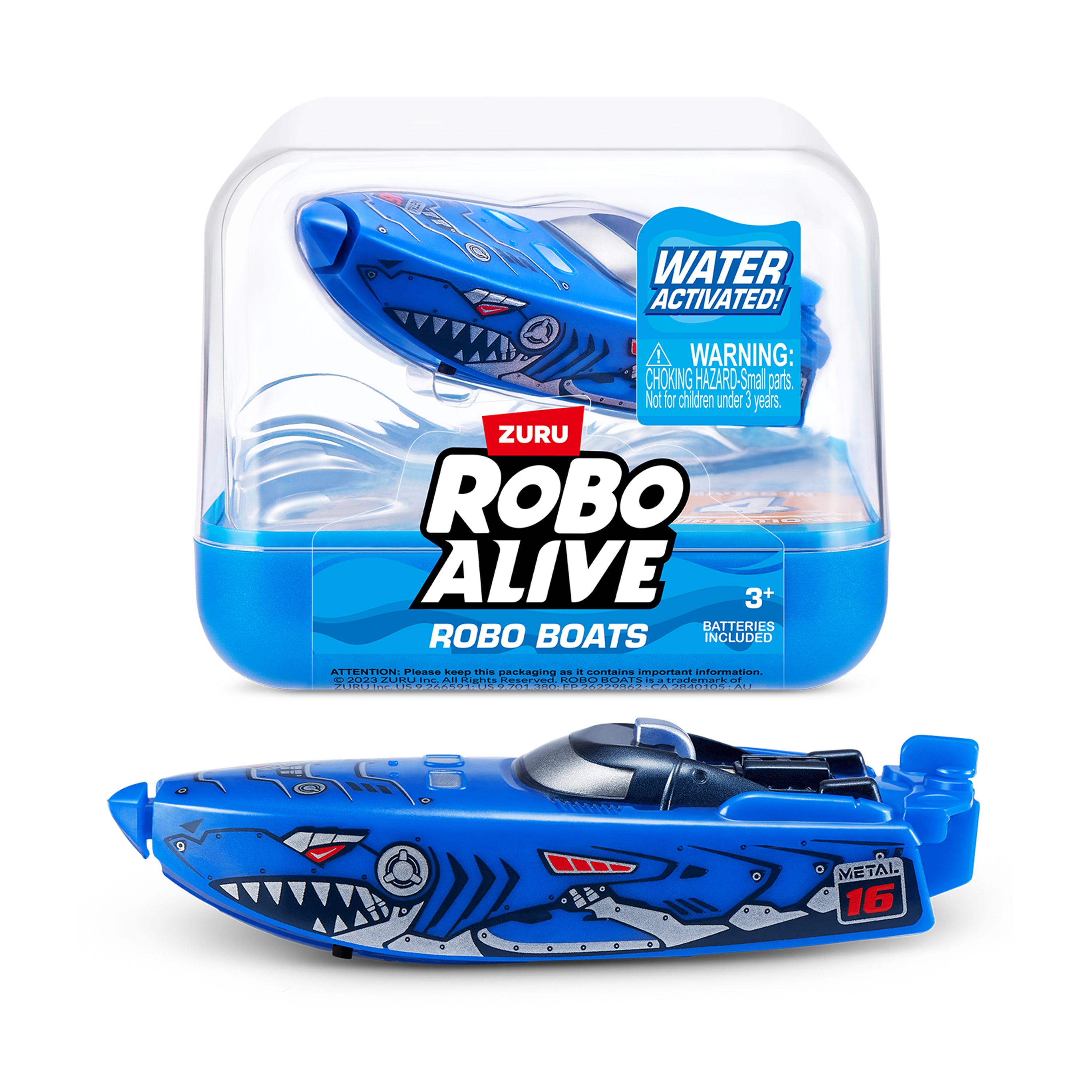 All aboard the new Robo Boats from Robo Alive! These water activated boats speed through water just like real boats. Watch as they race in 4 different directions using electro-magnetic coils and 2 patented technologies. There are 4 epic Robo Boats to collect, harbor them all for the ultimate Robo Alive boat race. It's more than alive, it's Robo Alive.