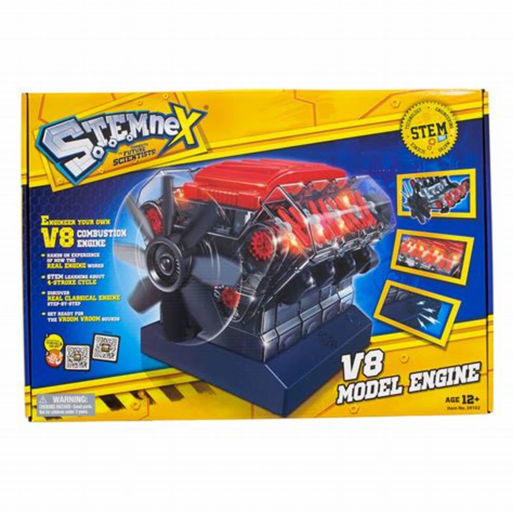 The Stemnex V8 Model Engine (39102) is an engaging STEM kit designed for enthusiasts aged 12 and above. This hands-on model allows users to assemble a fully functional V8 engine, complete with moving pistons, a rotating crankshaft, and firing spark plugs, simulating the operation of a real internal combustion engine. Comprising over 270 parts, the kit offers a detailed exploration of the 4-stroke cycle and engine mechanics. Once assembled, the engine measures approximately 8.5" x 6" x 5" and operates for about 30 seconds when powered by 3 AA batteries (not included). Crafted from durable, non-toxic materials, it serves as an excellent educational tool for fostering an interest in engineering and mechanics.