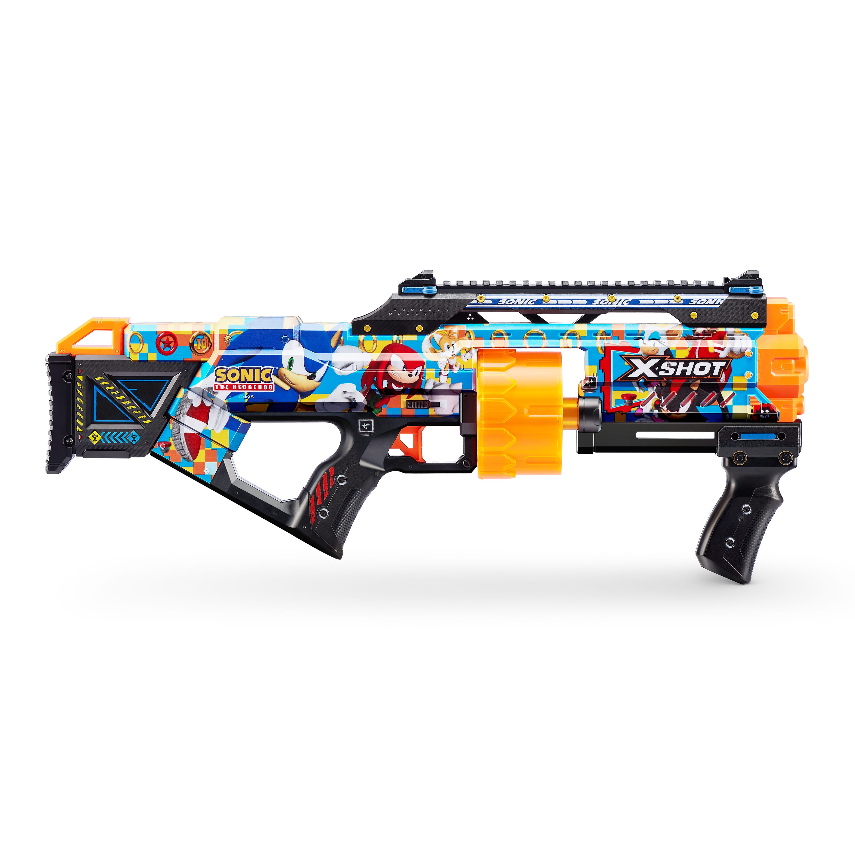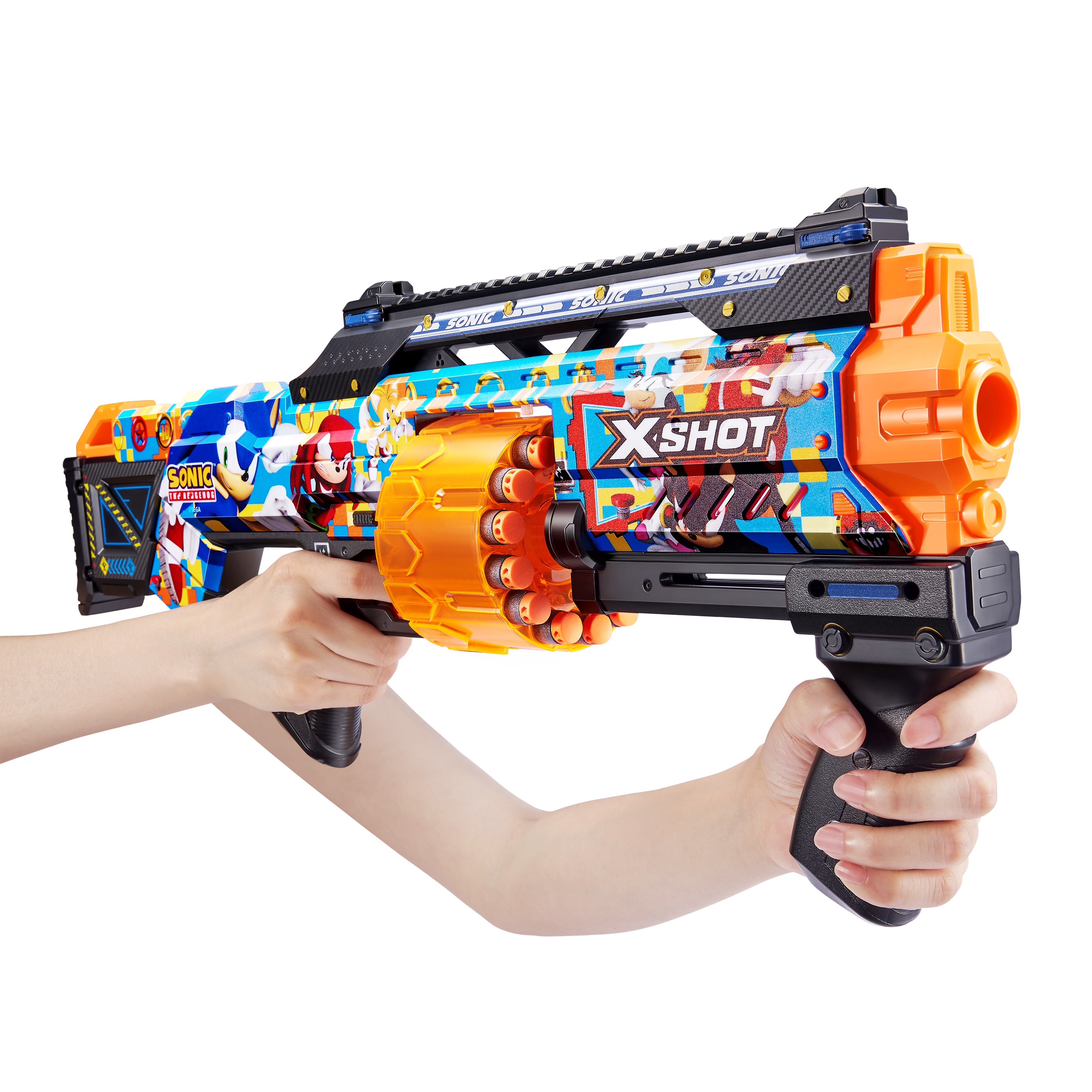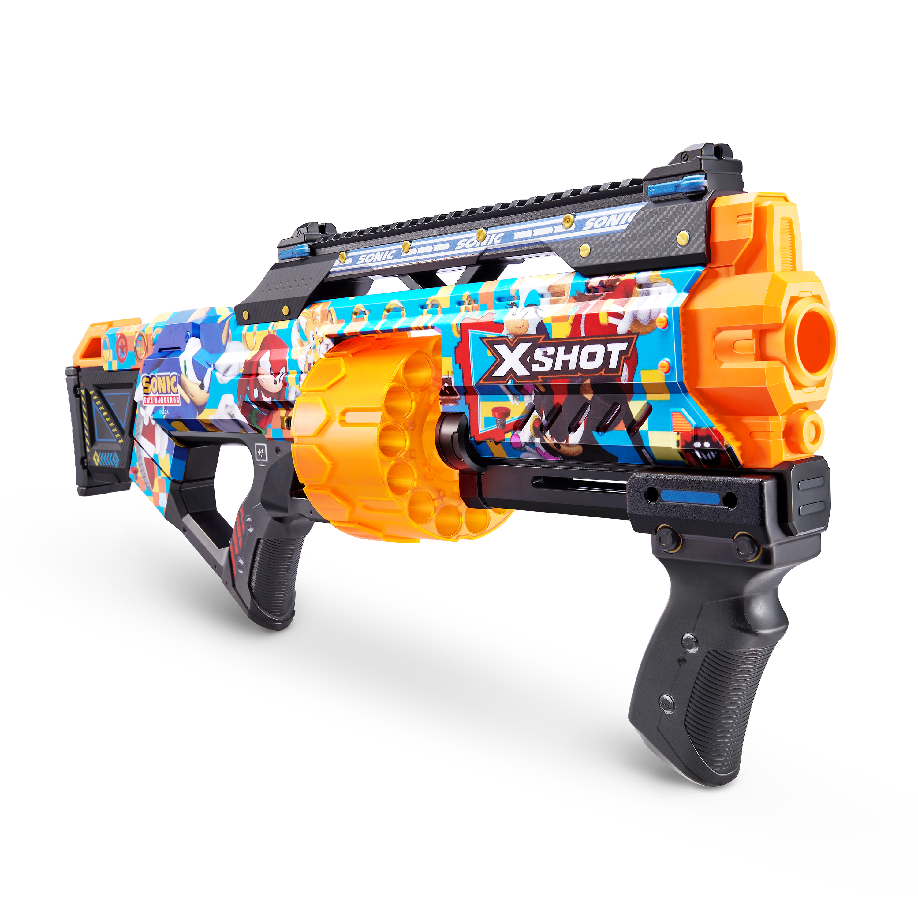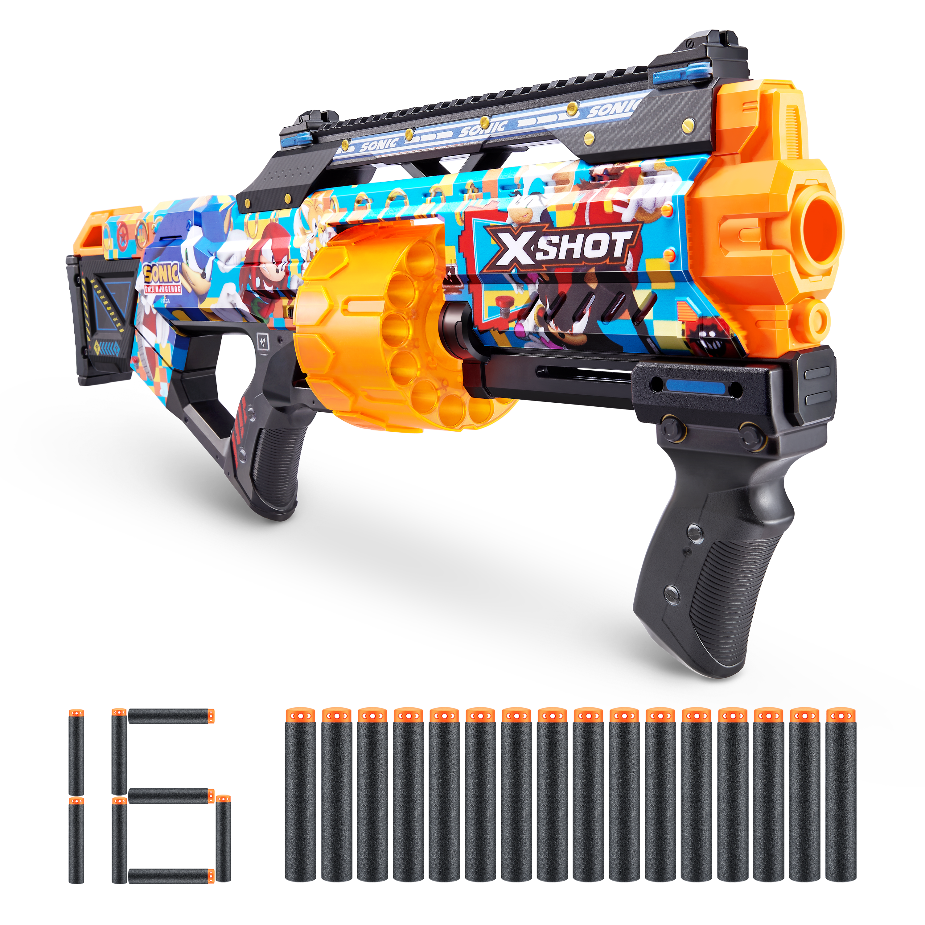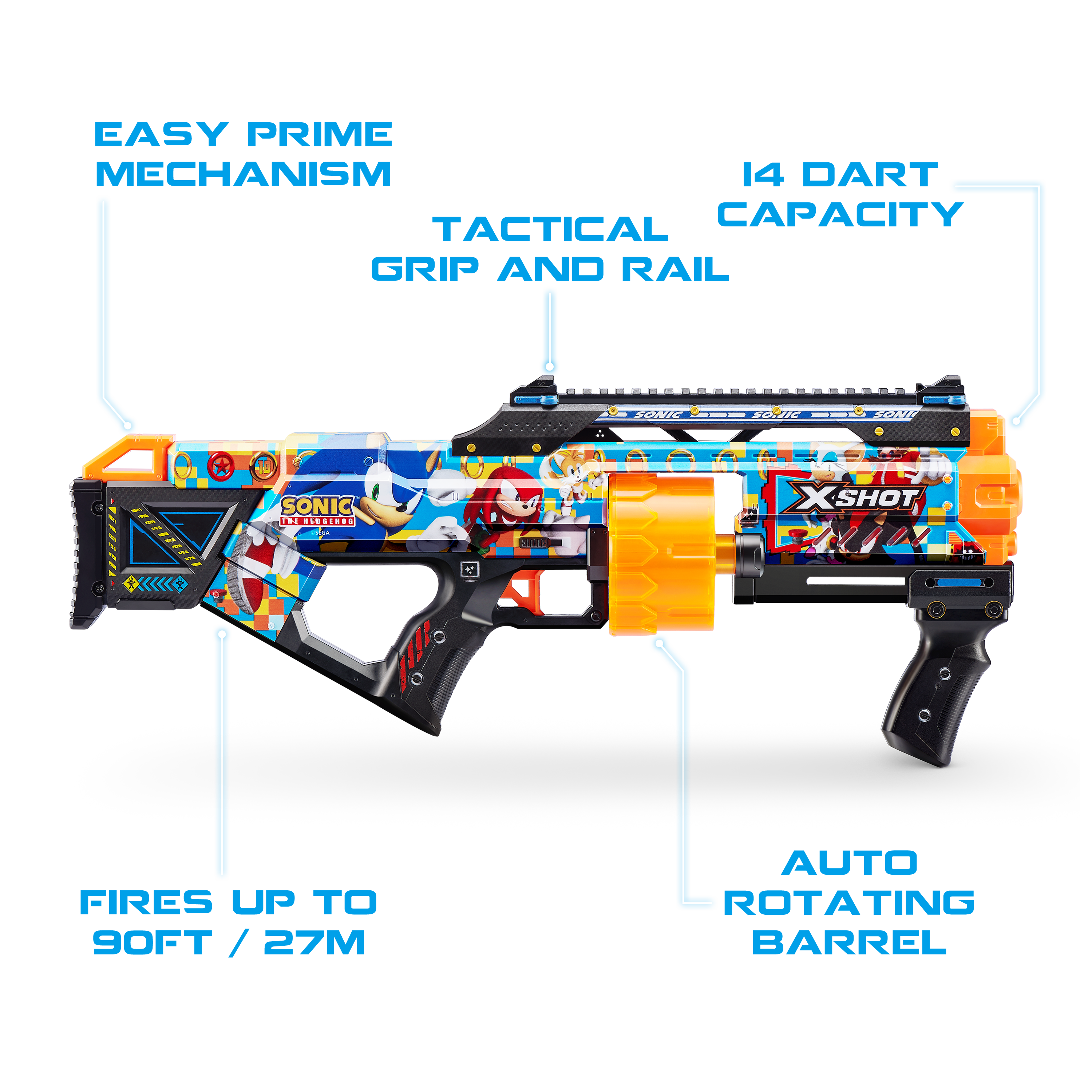 Skin your blaster with the super speed of Sonic the Hedgehog! With a 14-dart capacity auto-rotating barrel you can hit multiple targets up to 27m / 90 feet away. Unleash 14 darts in seconds thanks to its Slam Fire action. The Last Stand comes with a tactical grip and rail for easy loading and allows you to add accessories to your blaster to level up. Go NEXT LEVEL with XSHOT!