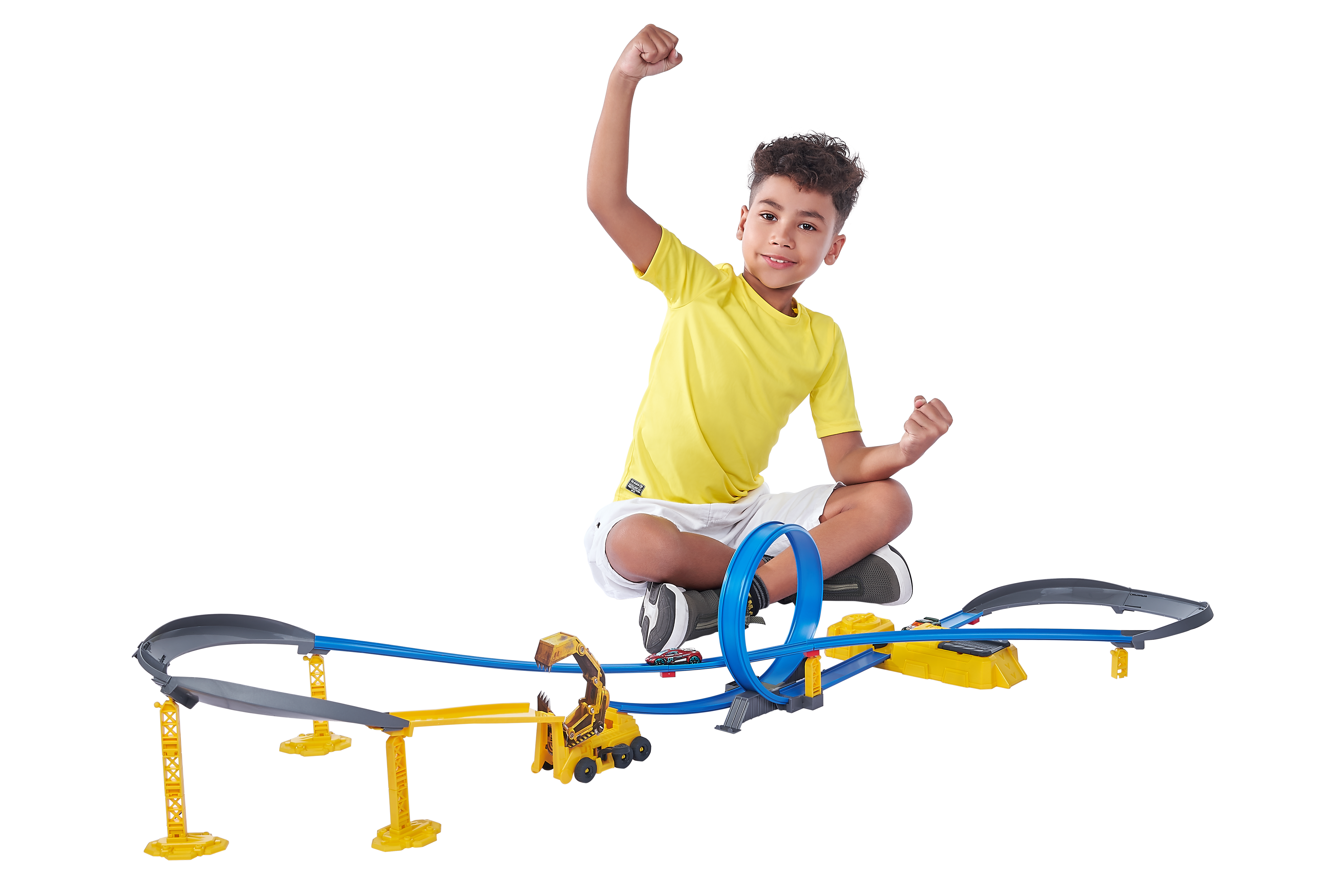 - PACK INCLUSION: 2x Metal Machine 1x Motorized Booster 1x Boulder Launcher Machine 1x Massive Racing Track including a 360Β°-Loop & Stunt Ramp 1x Crane Claw