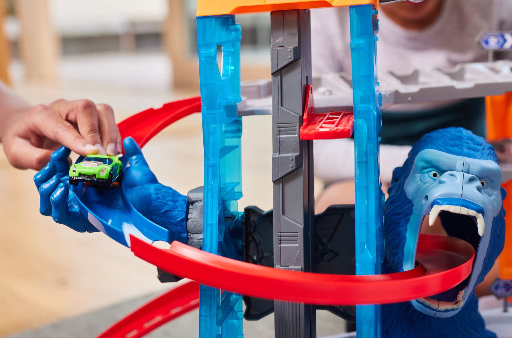 - INTERACTION FUN: Manually operated 2-car elevator. As one car is lifted up to the second or third flood, the second elevator lowers your car to the ground. On the first floor use the repair stations to fix your cars or show them off on the spinning gorilla arm. When things get dangerous us the rescue helicopter to bring your metal machines to safety.