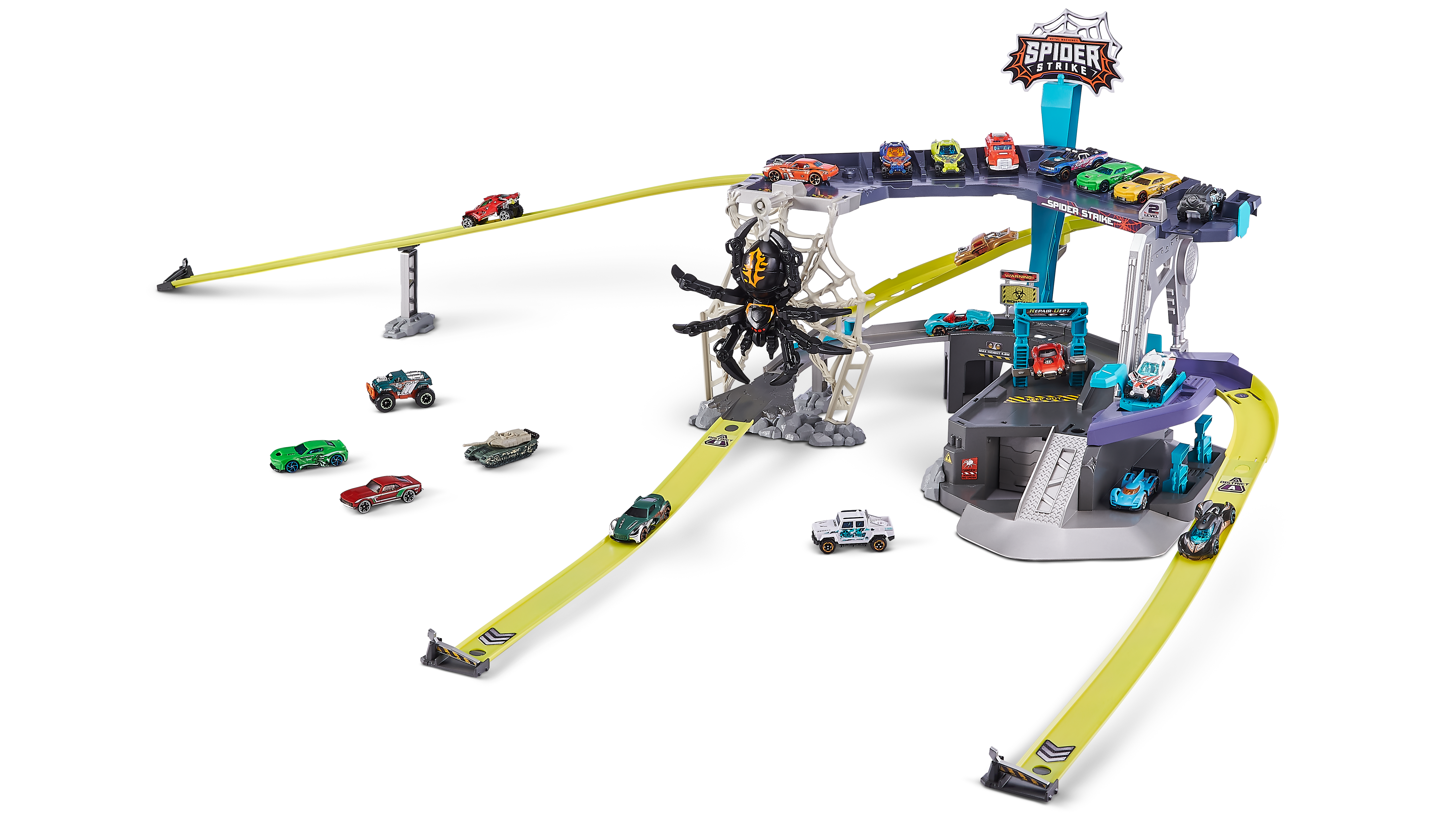 Unleash countless Metal Machines into this action-loaded playset that offers endless storytelling options and unlimited play fun. Speed through the massive Spider on its web to overcome the beast. The playset features a multi-level garage, through the integrated and manually operated car elevator. The two levels hold parking and stand-by spots for more than 8 cars as well as 1 auto repair station and garage to store your cars. Most track and playset pieces are interchangeable and also track directions can be changed to allow infinite track possibilities. Swing the Spider and see if you can make it through the track unharmed. Enjoy the exclusive ‘wild thing’ car and add it to your Metal Machines collection.
