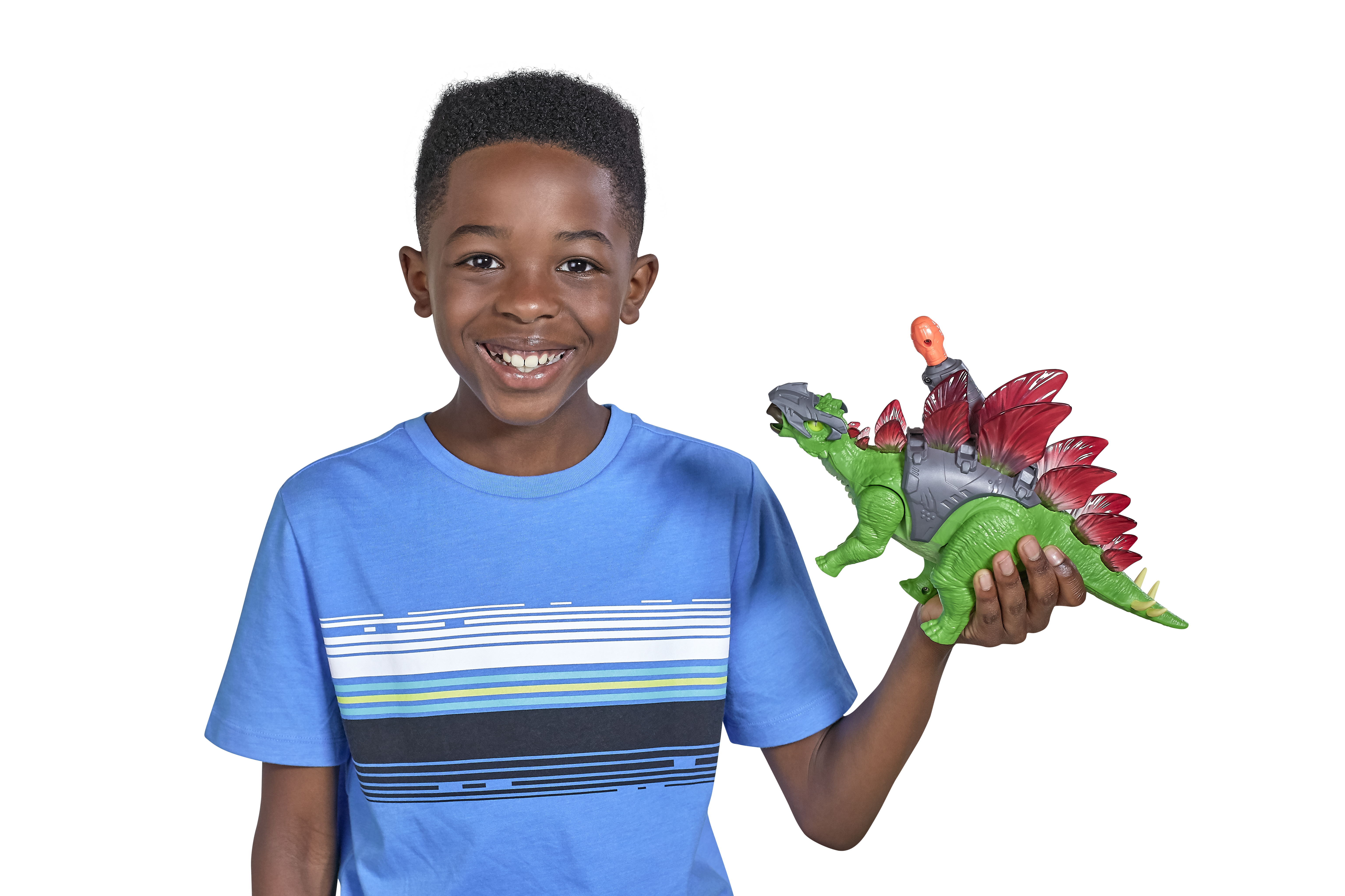 - NEW DINO BLASTER: This Stegosaurus is ready for Battle! Fully equipped with a dino blaster that can fire 7 feet and three plates of defensive armor. Perfect for any dino battle!