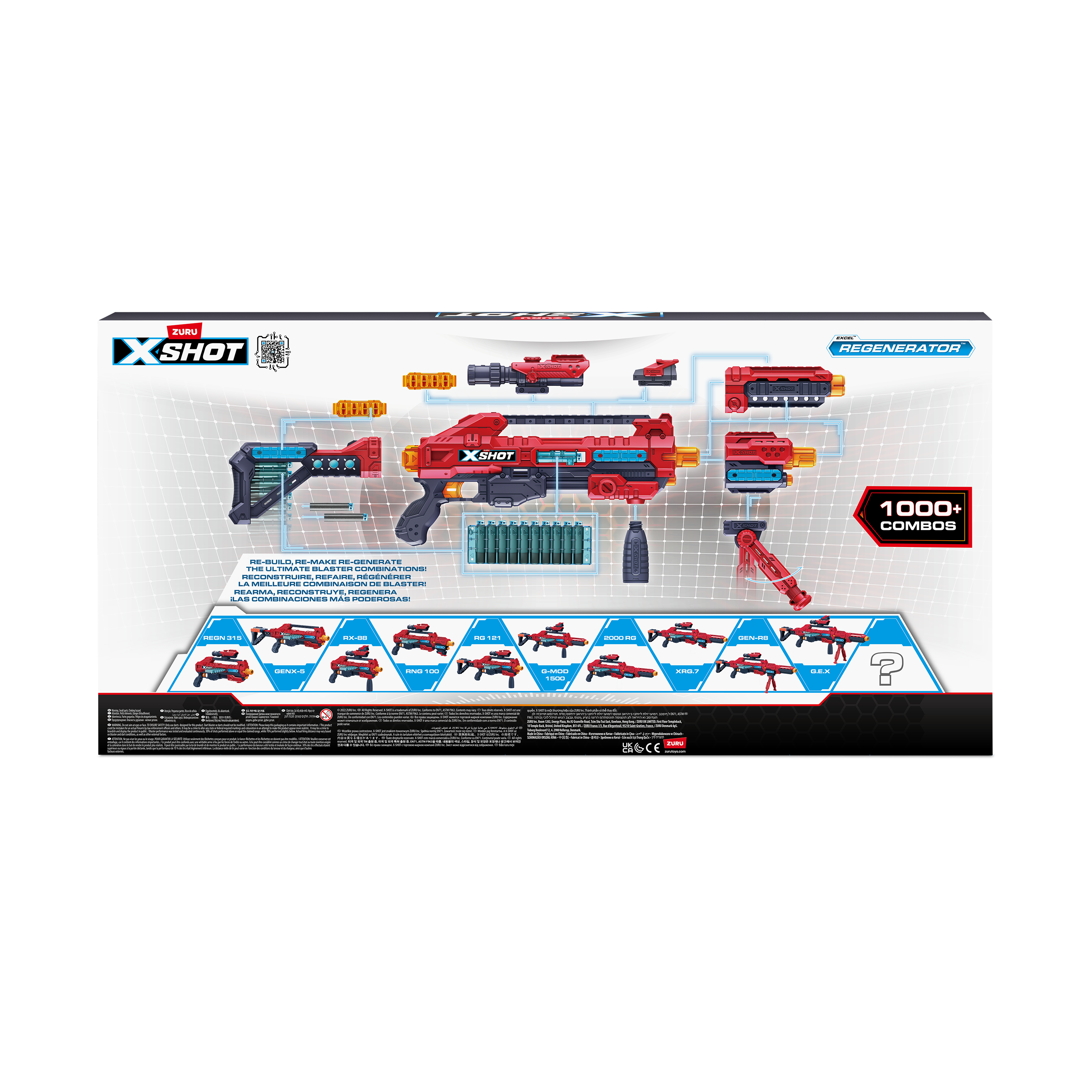The XSHOT Regenerator is the ultimate customizable blaster to take into any battle. With 12 inter-changeable attachments, you can create over 1000 unique blaster combinations. Use the bipod and sight for precise target shooting or swap to the short barrel and front grip for agility. Whatever your style, fire with power with the Regenerator’s 24m /80 feet firing range! With 2 dart clips that hold 10 darts each and 48 darts in pack, you can survive even the longest of battles with this blaster. Be ready for whatever comes your way with the Regenerator.
