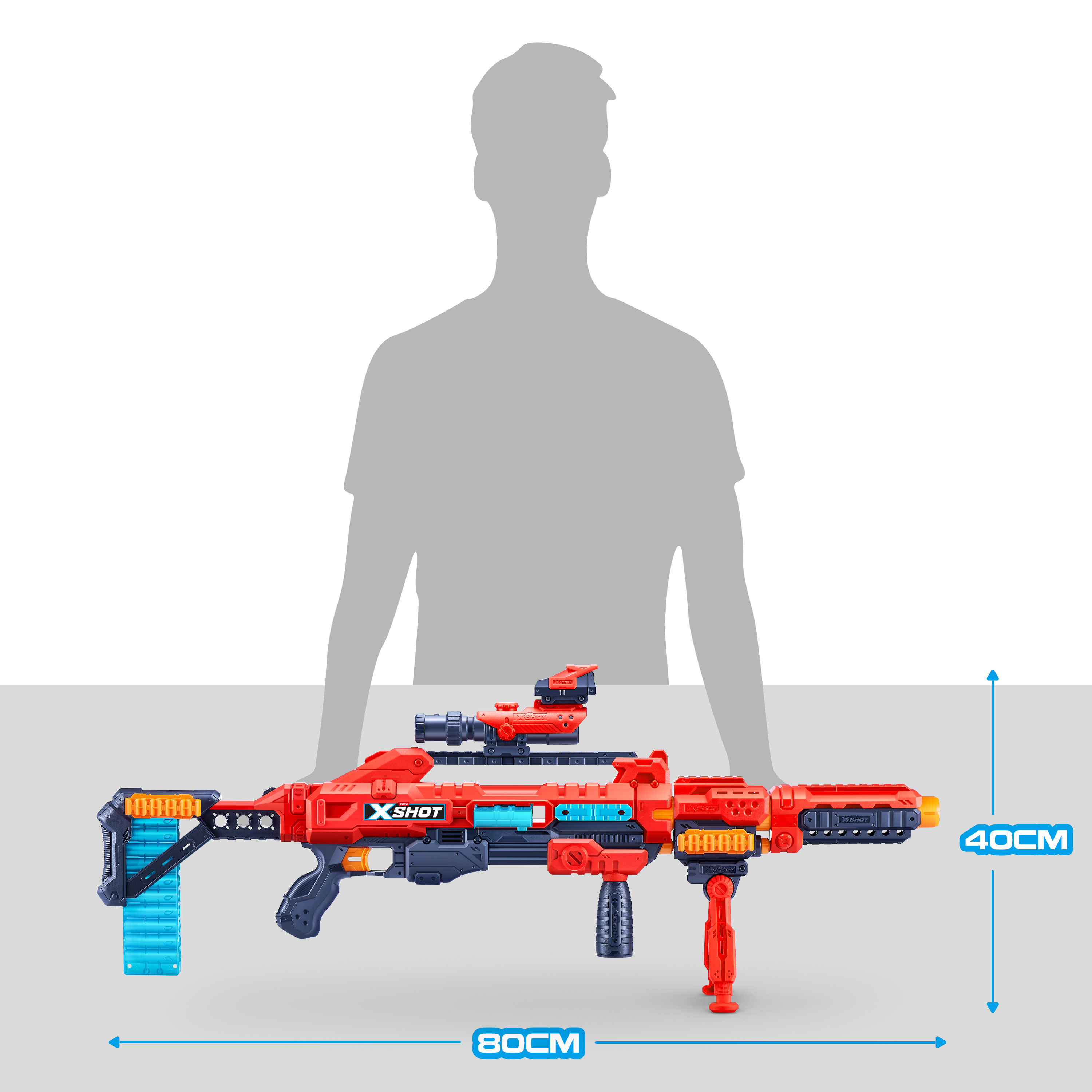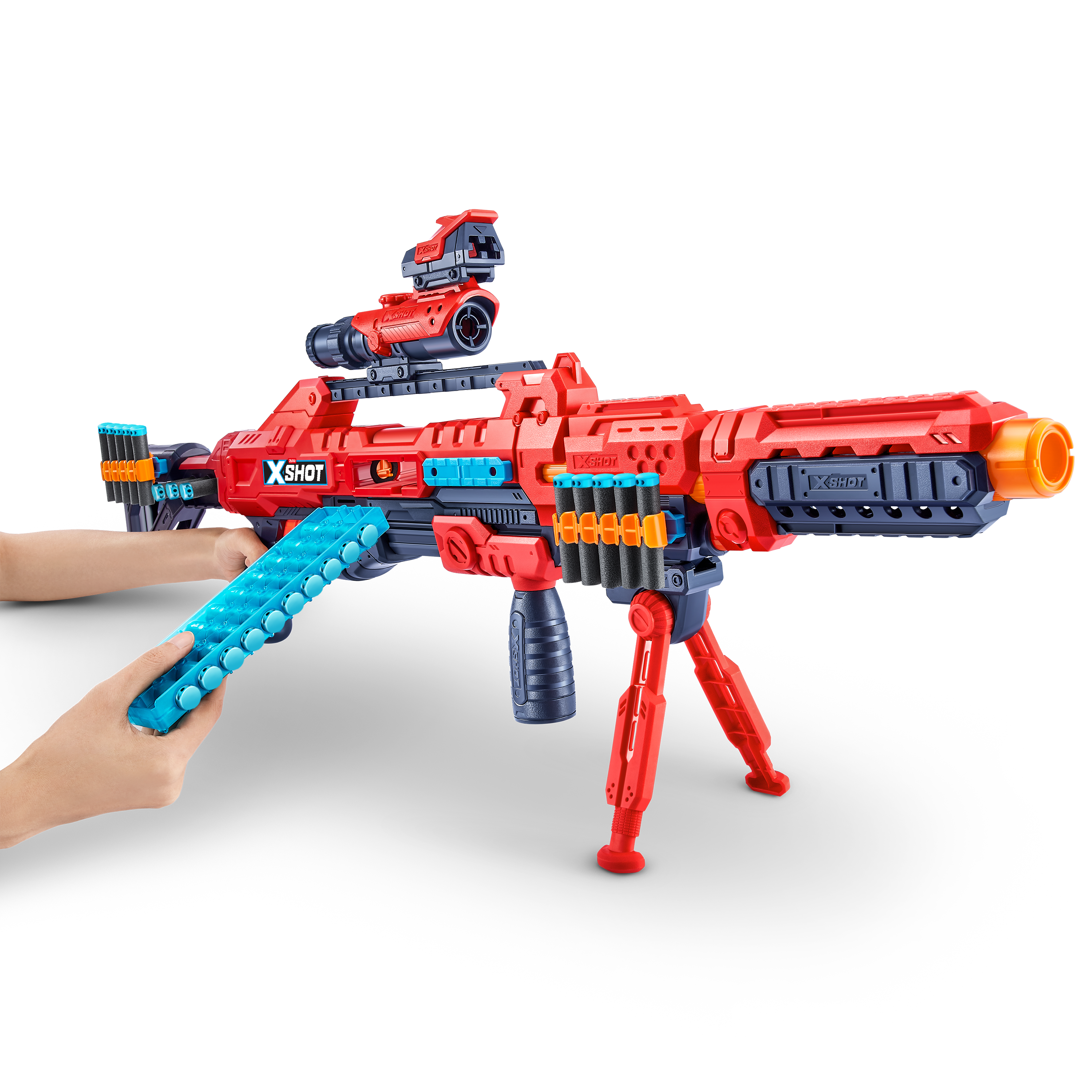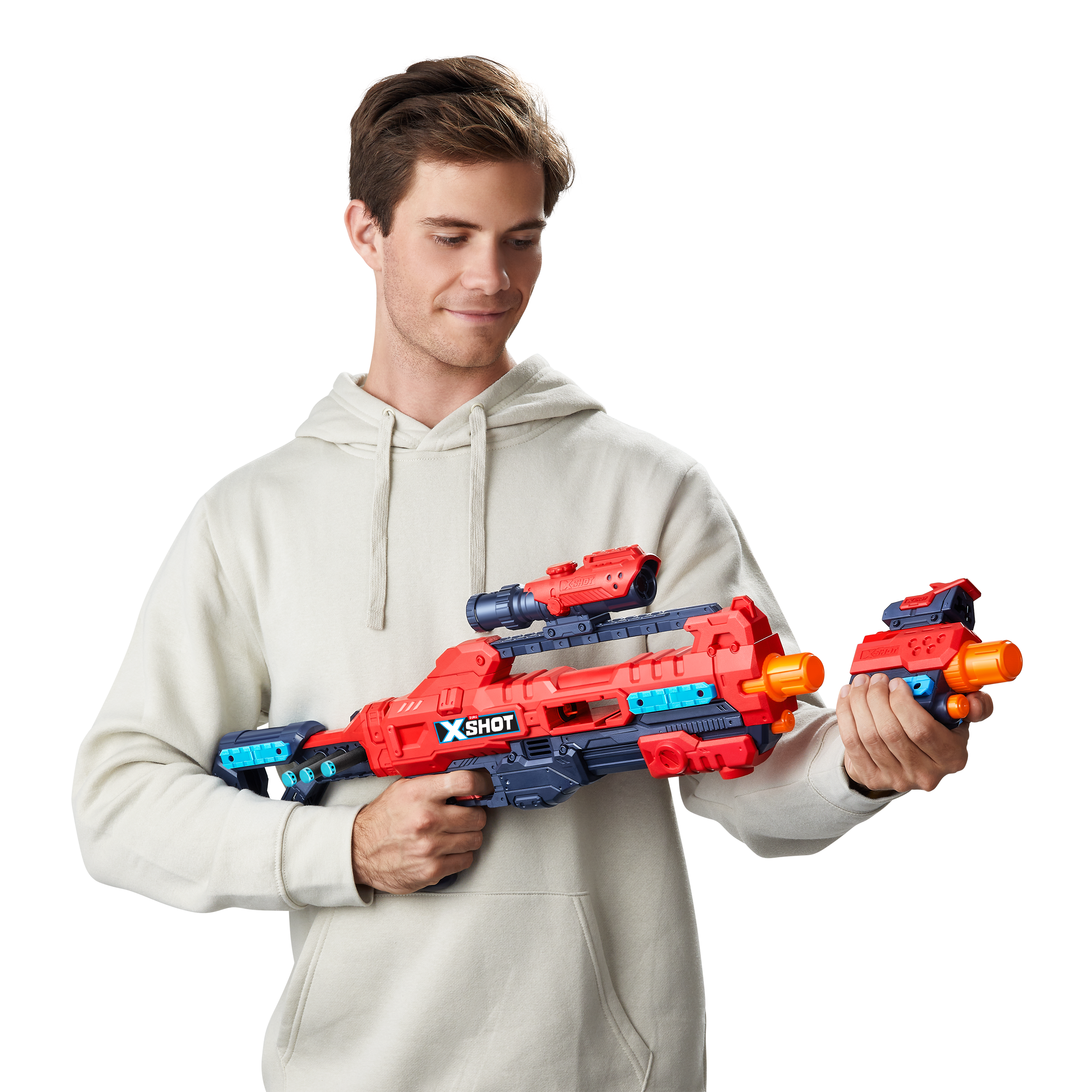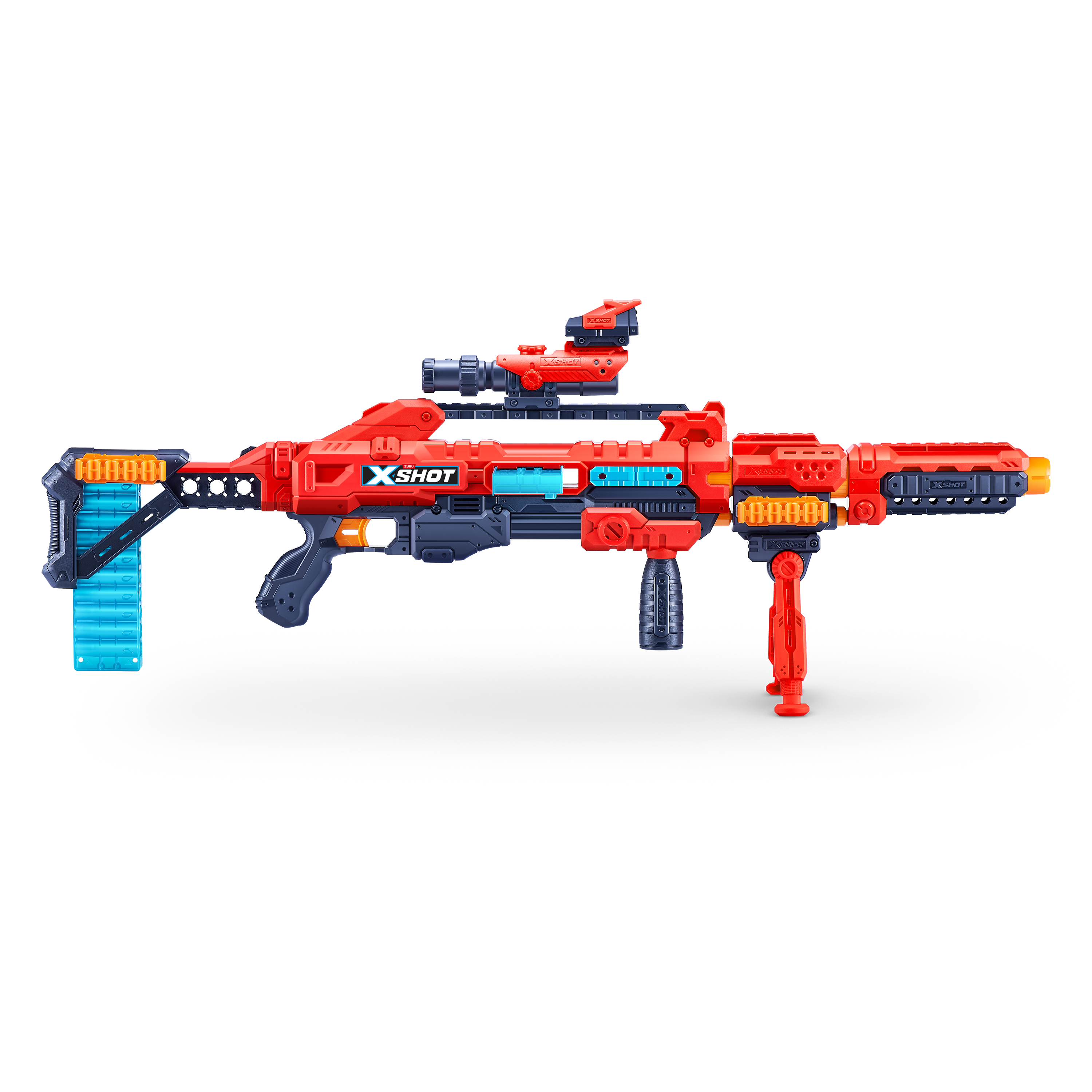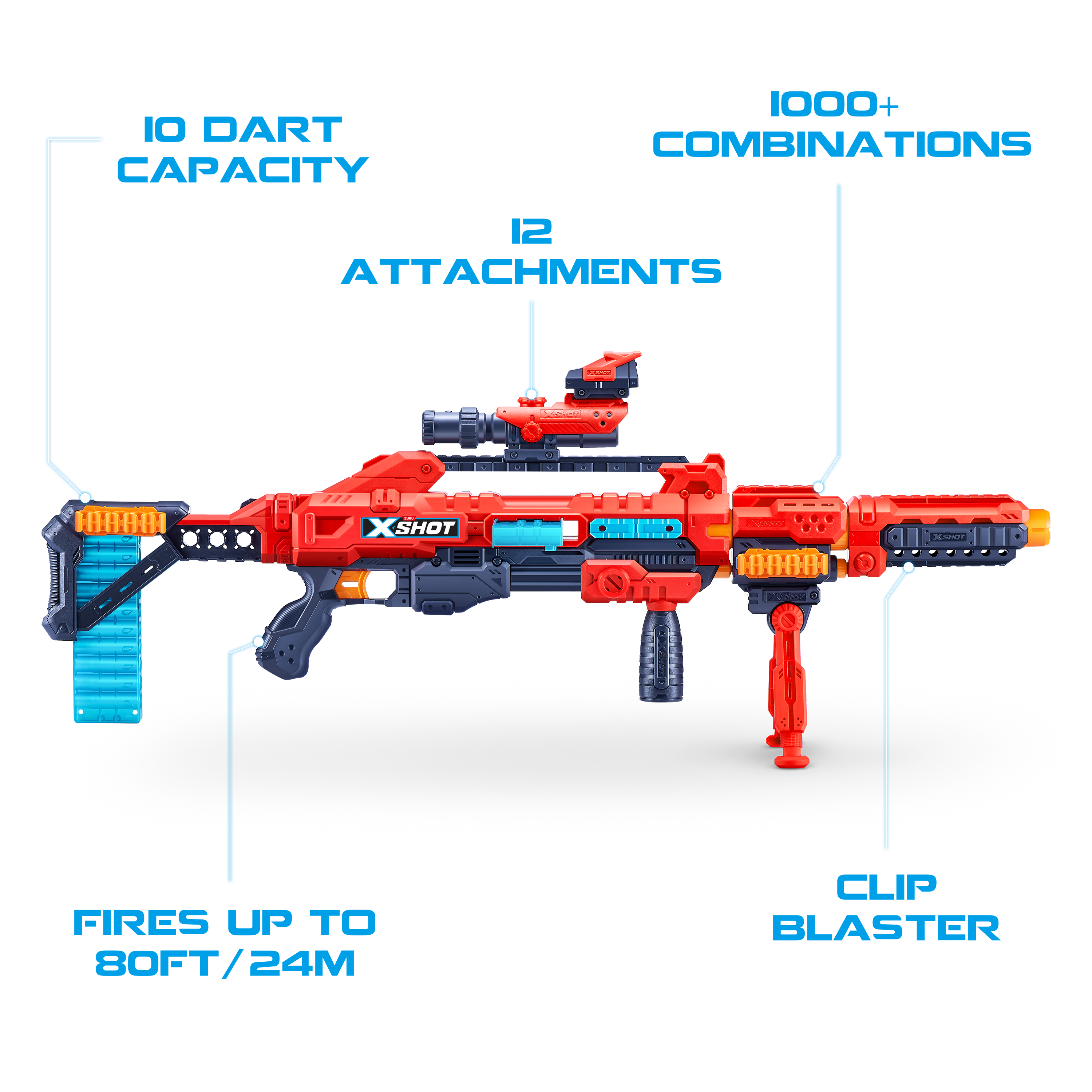 - 1000+ Combinations: Customize your XSHOT Excel Regenerator with 12 inter-changeable attachment accessories including a removeable stock, sight, scope, short barrel, long barrel, fold out bipod, front grip, ammo holders and 2x 10-dart clips and 48 darts.