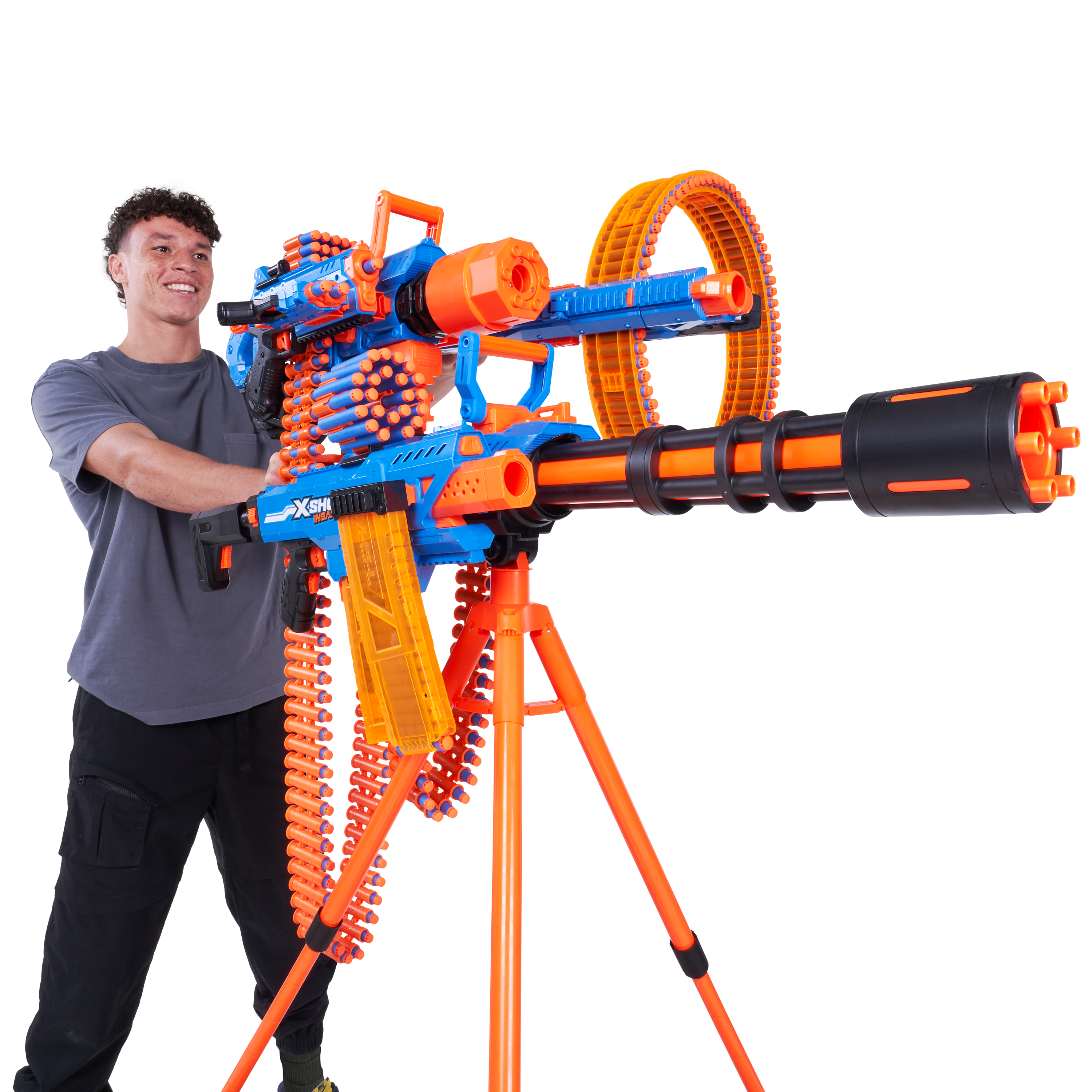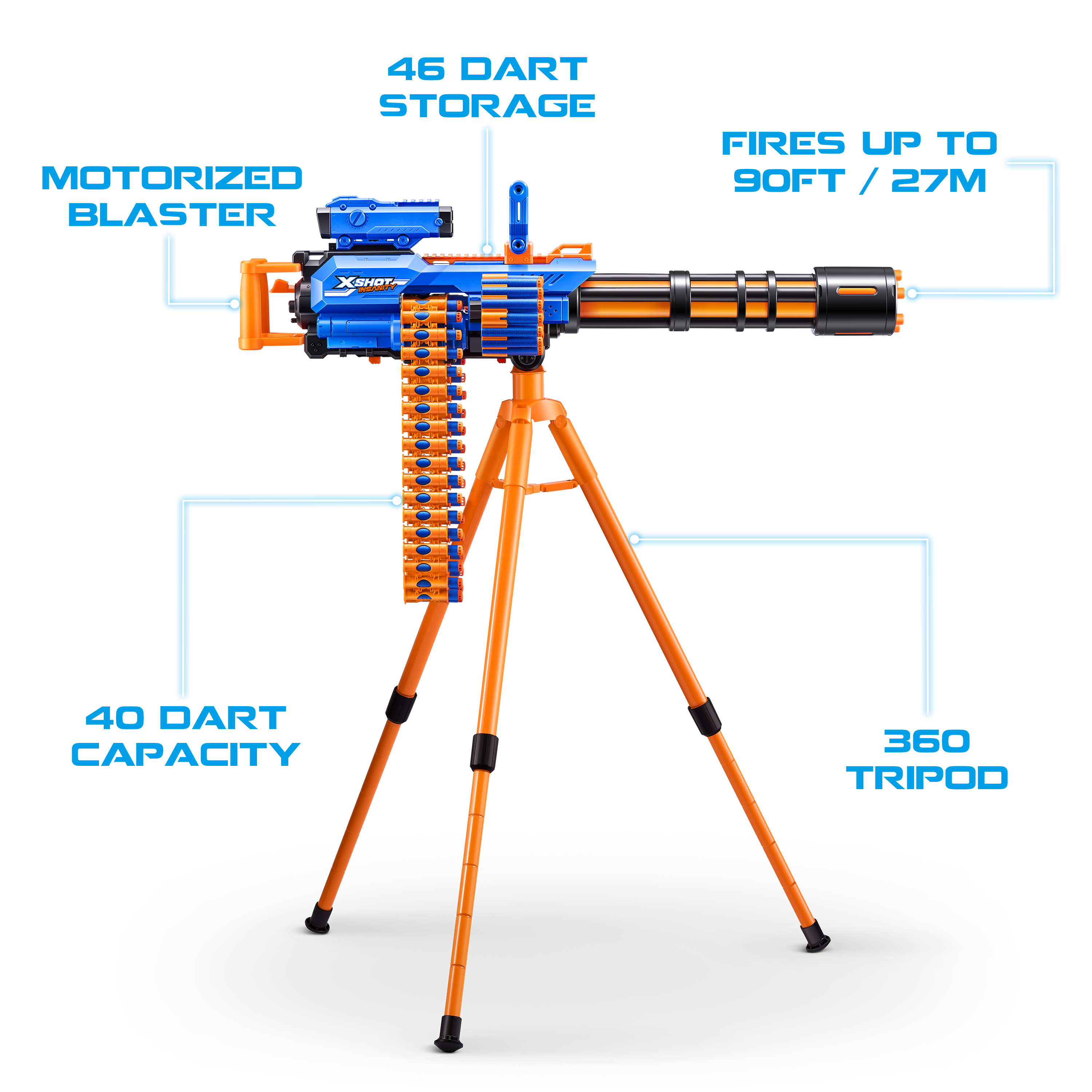 Insane combos, ammo and action with XSHOT Insanity! The XSHOT Insanity Motorized Rage Fire is the biggest and most insane blaster in the Insanity Range! The Motorized Rage Fire is so big it comes equipped with a tripod. Load up its 40 dart auto feeding belt to take out multiple targets from up to 27m / 90 feet away in seconds! Plus it comes with an insane amount of accessories and dart storage to hold an additional 46 darts to keep you locked and loaded in battle. XSHOT darts include Air Pocket Technology for a faster, further, and more accurate blast. Combine the Motorized Rage Fire with other Insanity blasters to make the most insane blaster!