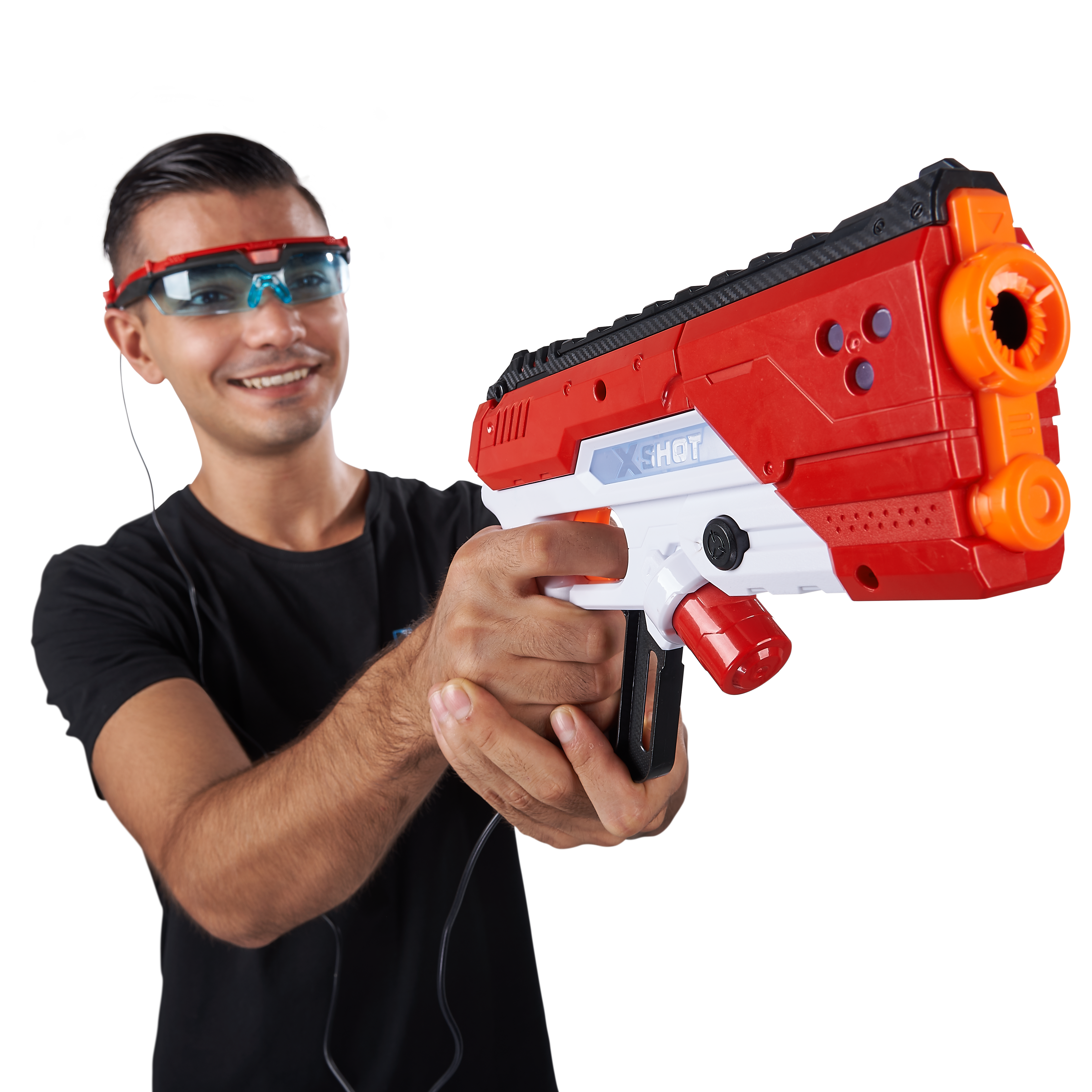 - NEXT LEVEL PERFORMANCE: XSHOT Laser360° comes with 2 laser blasters and two 360° goggles. An unlimited number of players can be split in up to 4 teams. Laser blasts can reach up to an incredible 180ft.