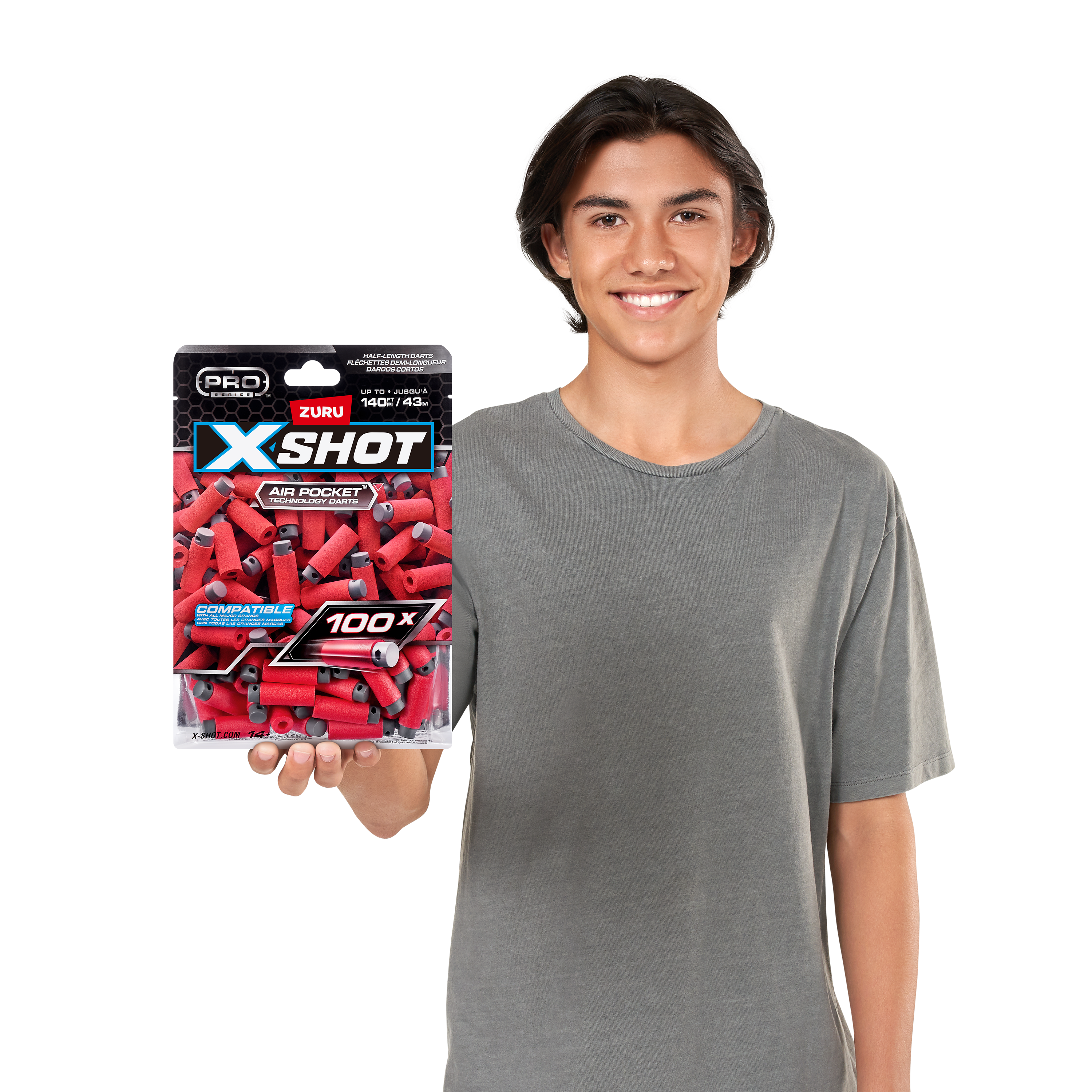 Go Pro with the 100 dart refill pack that comes in a resealable bag! XSHOT Half-Length Air Pocket Technology Half Length Darts are designed for a further, faster, and more stable flight and are compatible with the XSHOT Pro Series range of blasters. Comes in a resealable bag for easy storage after the battle is over.