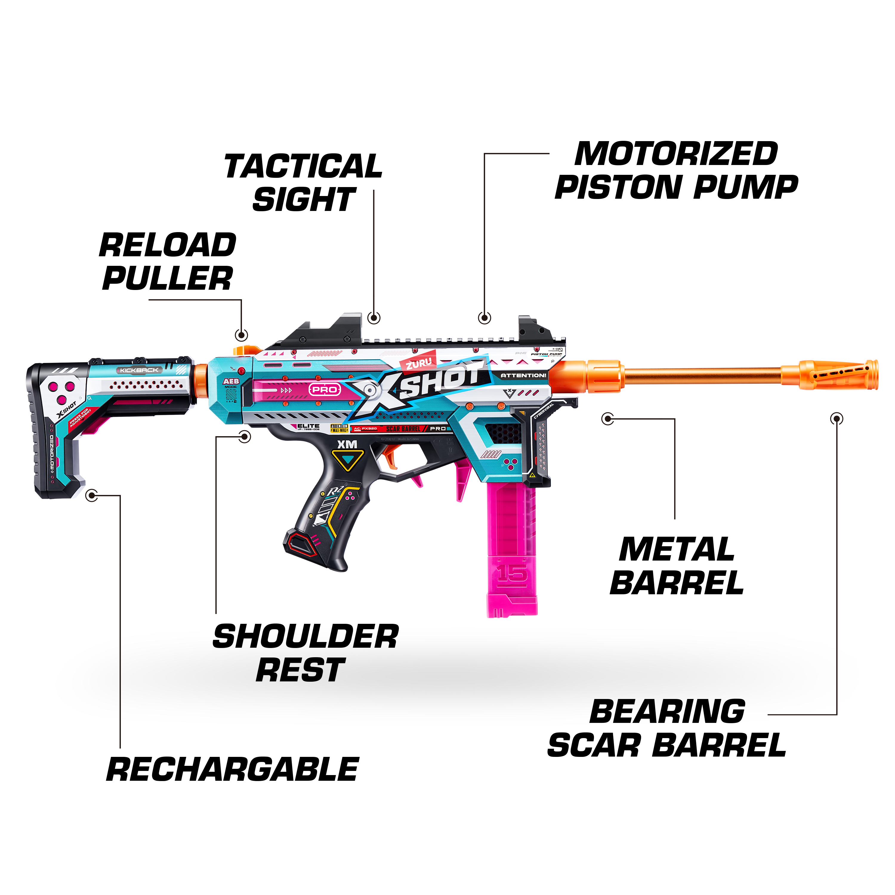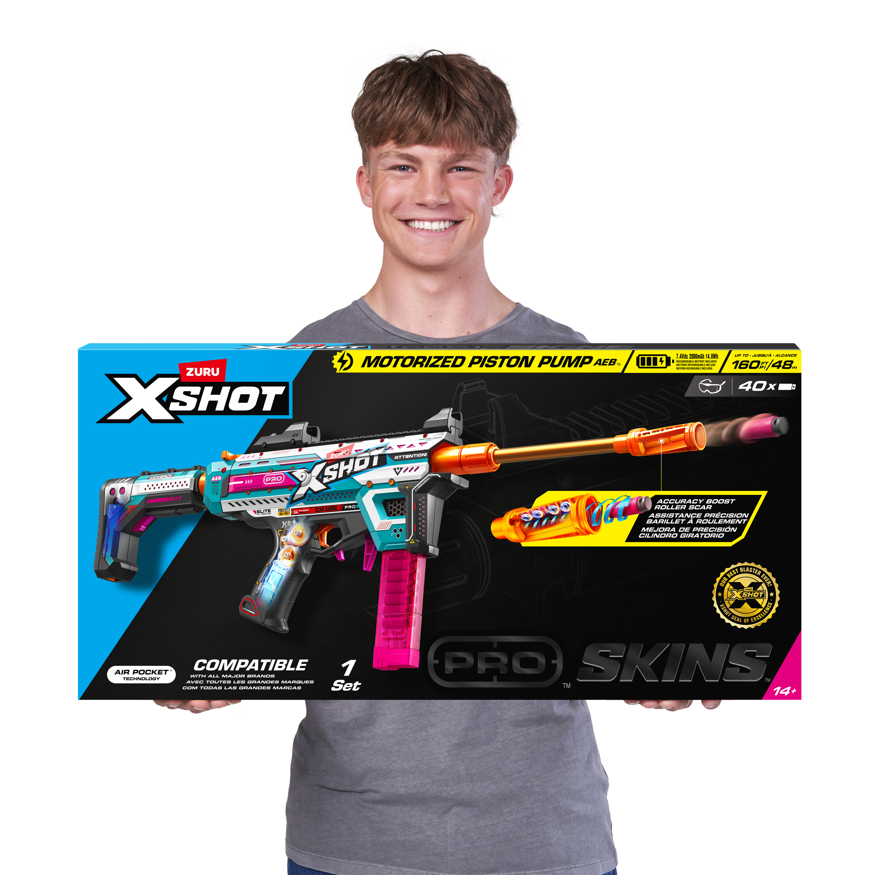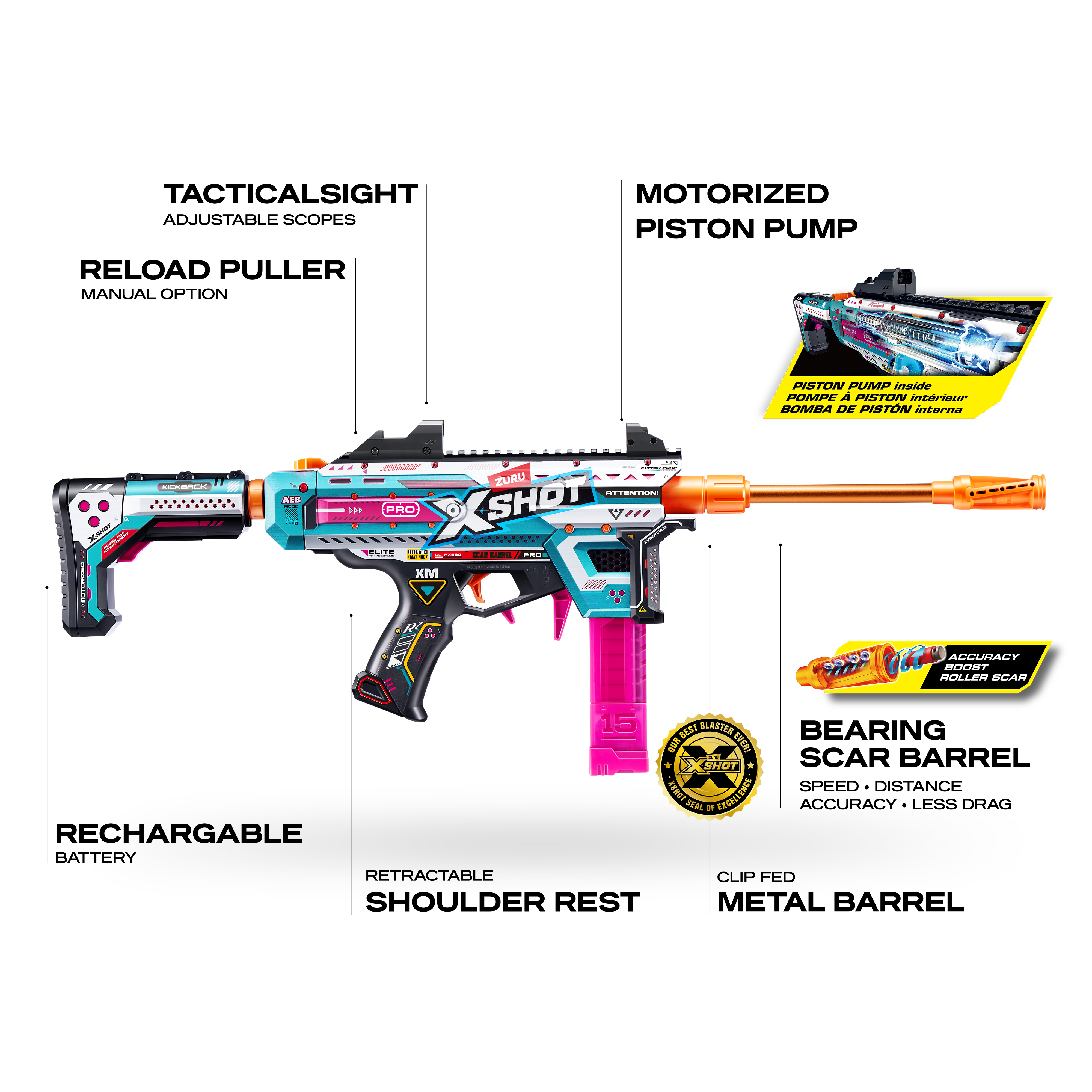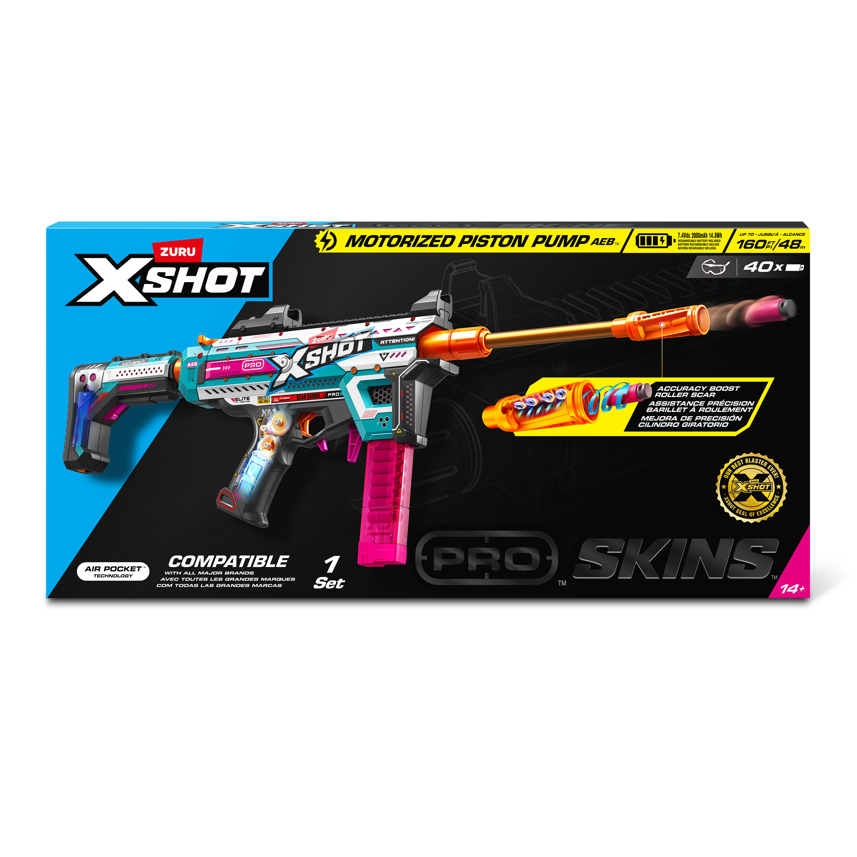 Elevate your dart blasting skills with the XSHOT Pro Motorized Piston Pump blaster, the first ever XSHOT AEB! Expertly crafted for precision and power, this blaster, marked by XSHOT's renowned seal of excellence, is our most advanced model yet. Its accuracy pro roller scar ensures stability and precision in every blast, even in the heat of battle. Recommended for ages 14+, with an impressive firing range of up to 160fps, you'll hit your targets with ease and maintain a tactical advantage over your opponents. The innovative roller scar not only boosts accuracy but also packs a punch enhancing the blasters performance. Whether you're battling your friends or taking on distant targets, the XSHOT Pro Motorized Piston Pump enables you to dominate any situation. Experience the NEXT LEVEL of dart blasting with the XSHOT Pro Motorized Piston Pump AEB and make every blast count!