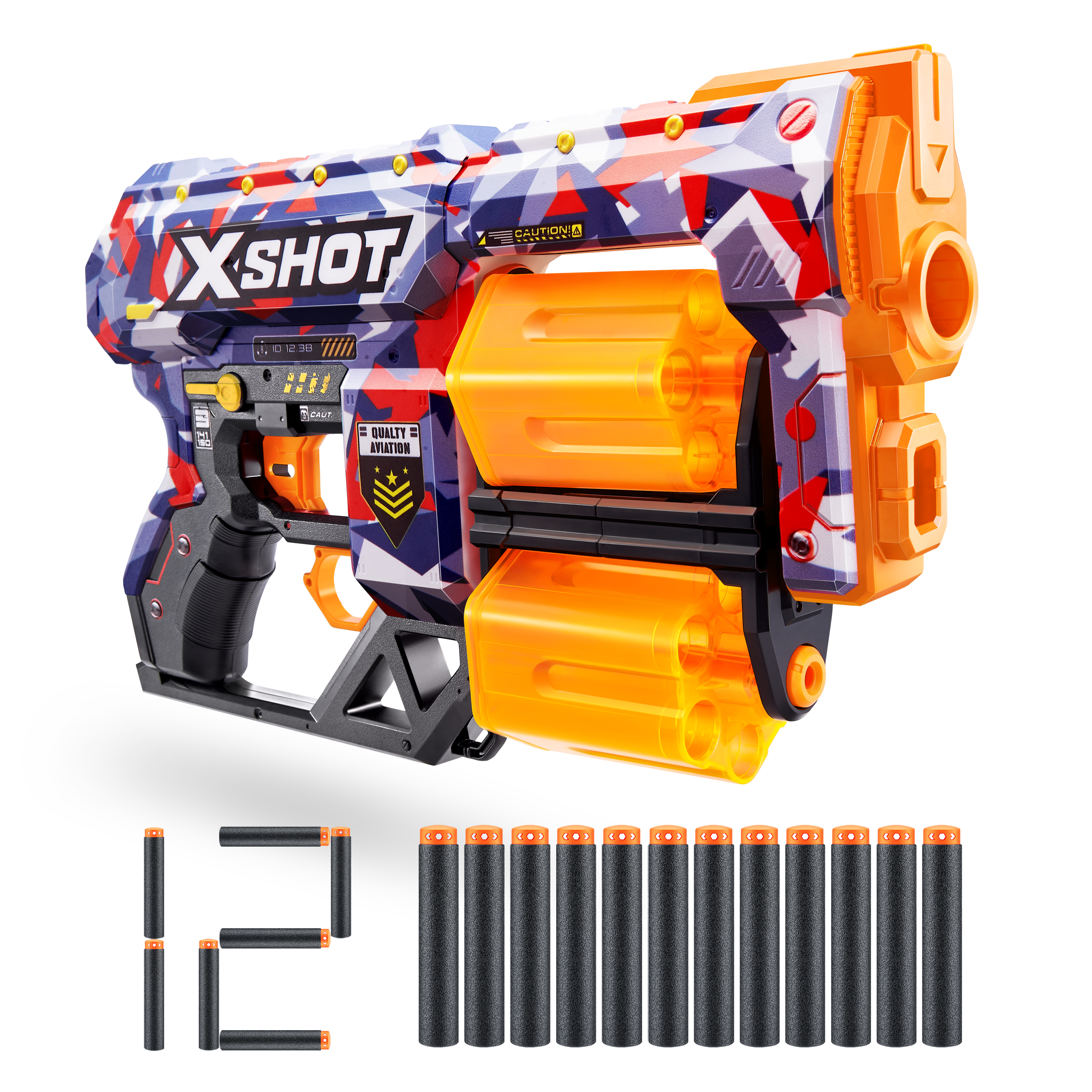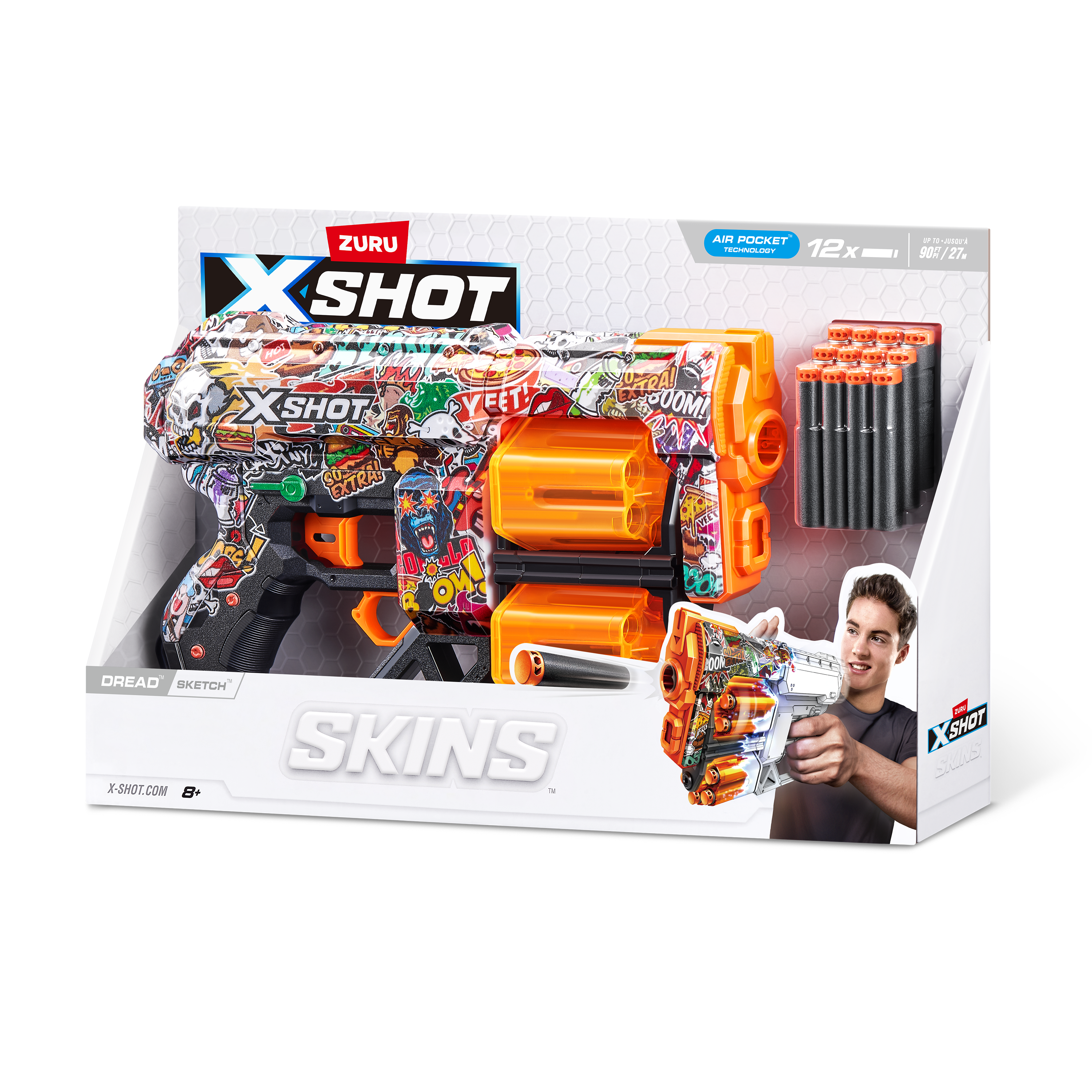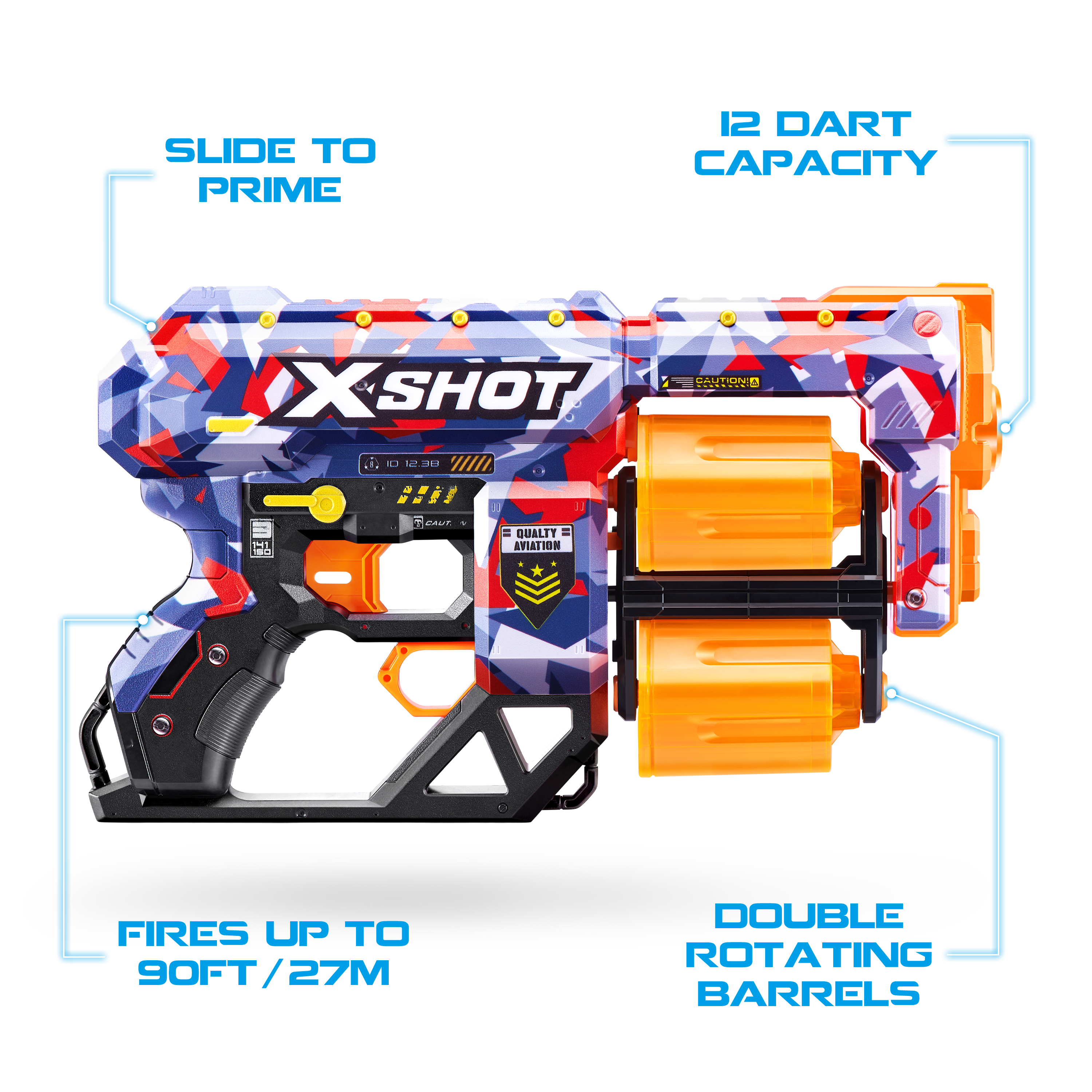 Introducing the Zuru X Shot Skins Dread 36517! Immerse yourself in the ultimate blaster customization experience with X-Shot Skins. Choose your Skin, gear up, and join the battle like never before. Prepare for epic mayhem with the X-Shot Skins Dread, featuring a dual ammo system that doubles the excitement. With its 12-dart capacity and double trouble rotating barrels, you'll be locked and loaded for non-stop fun. When you run out of darts in one barrel, simply switch over to the second one and unleash a barrage of foam fury on your competition from up to 27m / 90 feet away.