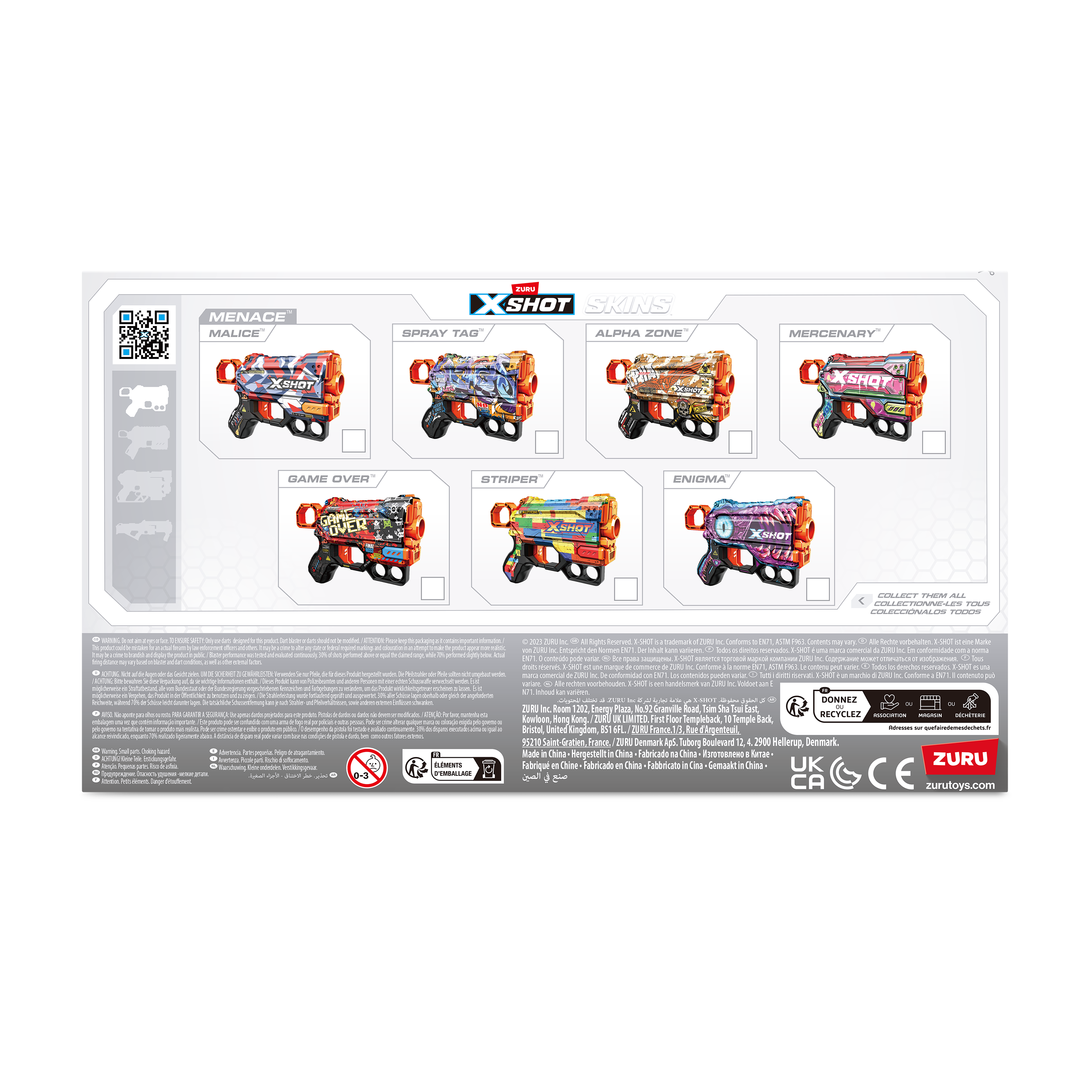 Introducing the Zuru X Shot Skins Menace 36515! Experience the thrill of in-game blaster customization brought to life with X-Shot Skins. Choose your Skin and immerse yourself in the battle. This compact blaster is the perfect addition to your collection, packing a powerful punch that reaches targets up to 27m / 90 feet away. With easy reload and bottom dart storage, you'll stay in the action without missing a beat. The Menace's small size makes it an ideal concealed weapon for surprising your enemies.
