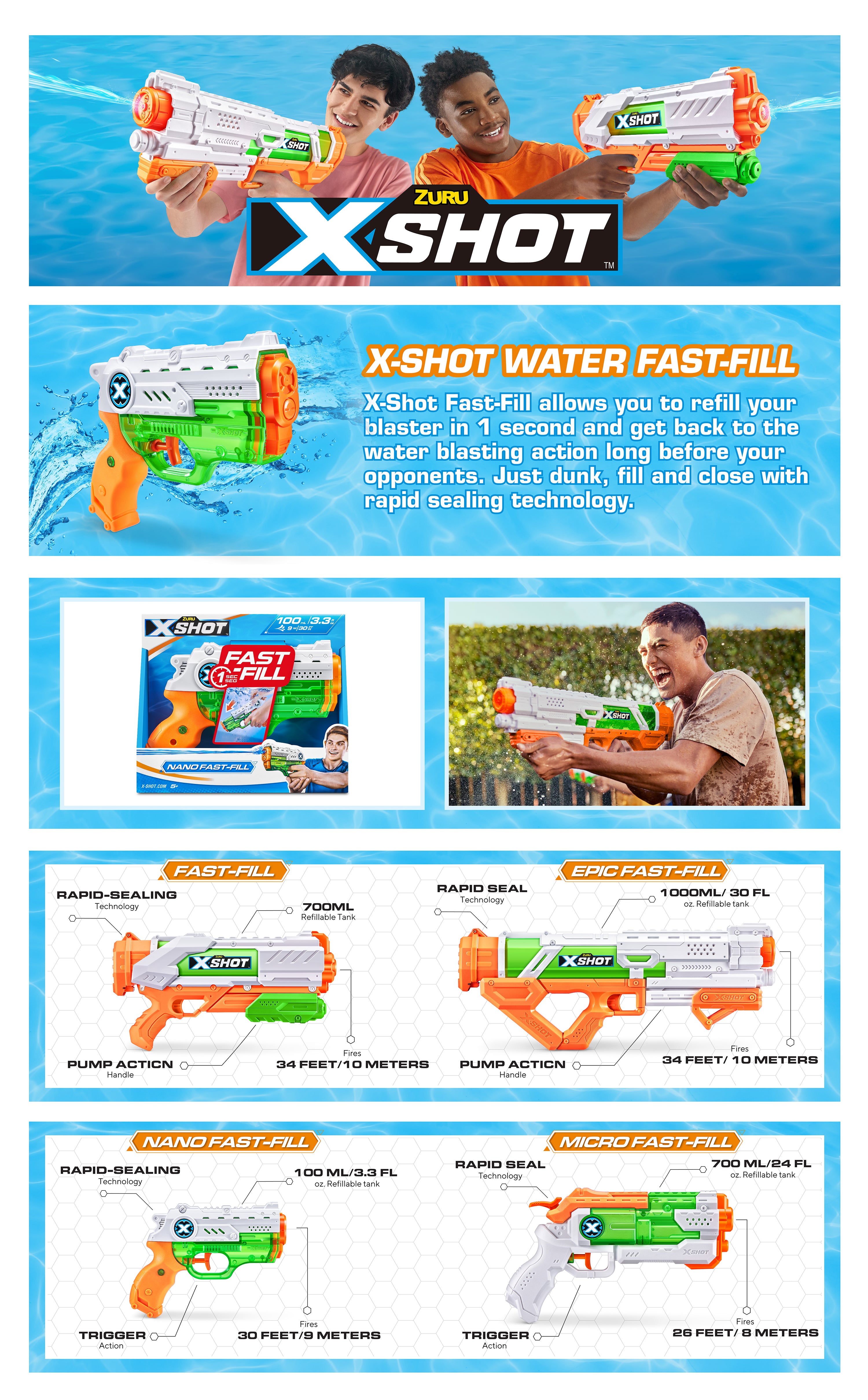 XSHOT Fast-Fill is the fastest filling water blaster ever created. The XSHOT Fast-Fill Nano allows you to refill your blaster in just 1 second and get back to the water blaster action long before your opponents. Just dunk, fill and close with rapid sealing technology. Don’t let the Nano's size fool you! Small but powerful, blast up to 30 feet / 9 meters with its 100mL/3.3 fl. oz. water capacity tank!